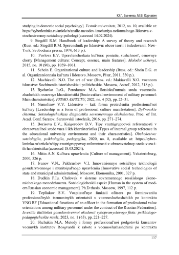 2. Быченко, Ю.Г. Способности к профессиональной адаптации в системе профессионального потенциала российских офицеров / Ю.Г. Быченко // Известия Юго-Западного государственного университета. Экономика. Социология. Менеджмент. - 2023. - Т. 13, № 1. - С. 215-226. EDN: QLVCSQ