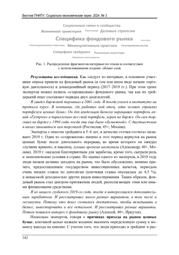 Введение. В российской социологии изучение различных аспектов функционирования фондового рынка и деятельности биржевых игроков началось в двухтысячные годы, наиболее заметными здесь стали работы социолога Д. О. Стребкова. Так, в 2007 г. были представлены результаты социологического анализа фондового рынка [1], также были опубликованы статьи автора, посвященные профессиональным и непрофессиональным игрокам на бирже [2], самоидентификации трейдеров-профессионалов [3]. Свой вклад в социологическое изучение особенностей рынка ценных бумаг вносит экономсоциолог Б. Б. Подгорный, рассматривающий данное пространство в качестве социального и информационного поля [4–7]. Современные отечественные исследователи активно изучают различные аспекты деятельности частных и институциональных инвесторов российского фондового рынка [8, 9].