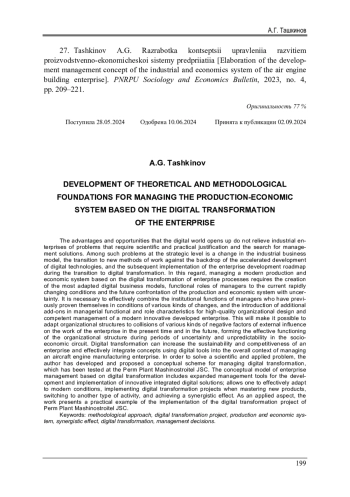 27. Ташкинов, А.Г. Разработка концепции управления развитием производственно-экономической системы предприятия / А.Г. Ташкинов // Вестник Пермского национального исследовательского политехнического университета. Социально-экономические науки. - 2023. - № 4. - С. 209-221. EDN: TUSGPS