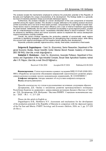 Рассмотрена динамика развития основных составляющих производственного потенциала Республики Бурятия и регионов Дальневосточного и Сибирского федеральных округов с низким уровнем социально-экономического развития. На основе анализа основных компонентов (основных фондов, инвестиций в основной капитал и пр.) дана сравнительная оценка производственного потенциала выделенных регионов и представлены рейтинговые позиции в разрезе субъектов Сибирского и Дальневосточного округов. В ходе анализа выделены применяемые механизмы наращивания производственного потенциала Республики Бурятия и показаны особенности его развития. По результатам сравнительной оценки выявлен в целом не высокий уровень развития промышленного потенциала депрессивных регионов. В ходе анализа отмечено неравномерное развитие основных составляющих промышленного потенциала исследуемых регионов. Складывающаяся ситуация обусловлена прежде всего сложившейся в регионах отраслевой структурой экономики и низким уровнем обеспеченности основными фондами на фоне высокой степени их износа, что отражается на снижении эффективности фондоотдачи и отсутствии собственных инвестиционных возможностей для их обновления. В свою очередь низкая норма накопления инвестиций в валовом региональном продукте на фоне слаборазвитой инновационной сферы производства обусловливает необходимость активизации усилий регионов по привлечению инвестиций путем выделения наиболее ключевых и узких векторов экономики для реализации предлагаемых на сегодня разнообразных способов и механизмов поддержки развития. В целом результаты исследования производственного потенциала регионов со слабым уровнем экономики позволяют определить состояния и способы его усиления с целью роста объемов производства промышленности с учетом региональных преимуществ и негативных факторов его развития.