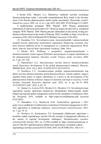 13. Доржиева, В.В. Государственная политика импортозамещения как фактор развития фармацевтической промышленности России: влияние санкций и шаги к успеху / В.В. Доржиева // Вестник Института экономики Российской академии наук. - 2022. - № 6. - C. 68-78. DOI: 10.52180/2073-6487_2022_6_68_78 EDN: PXZQFD