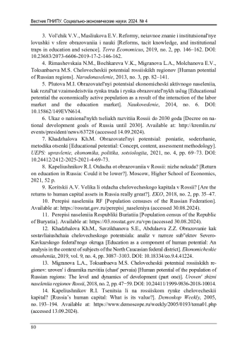 7. Хаджалова, Х.М. Образовательный потенциал: понятие, содержание, методика оценки / Х.М. Хаджалова // УЭПС: управление, экономика, политика, социология. - 2021. - № 4. - С. 69-73. DOI: 10.24412/2412-2025-2021-4-69-73 EDN: AAALKS