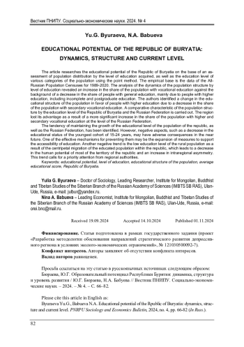 Анализируется образовательный потенциал Республики Бурятия на основе оценки распределения населения по уровню полученного образования, а также уровня образования различных категорий населения с использованием балльного метода. В качестве эмпирической базы использованы данные Всероссийских переписей населения 1989-2020 гг. Анализ динамики структуры населения по уровню образования выявил увеличение доли населения с профессиональным образованием на фоне снижения доли лиц с общим образованием главным образом за счет лиц с высшим образованием, включая незаконченное и послевузовское. Выявлено изменение образовательной структуры населения в пользу лиц с высшим образованием вследствие снижения доли населения со средним профессиональным образованием. Проведена сравнительная характеристика структуры населения по уровню образования Республики Бурятия и РФ в целом. Показана утрата преимущества регионом, заключающаяся в более высокой доле населения с высшим и средним профессиональным образованием в результате их более значительного роста на уровне РФ. Выявлена тенденция сохранения роста образовательного уровня населения республики, как и РФ в целом. Однако негативные моменты, заключающиеся в снижении образовательного статуса самой молодой когорты 15-24 лет, могут иметь неблагоприятные последствия в ближайшем будущем. Одним из действенных механизмов их предотвращения может быть расширение мер поддержки доступности образования. Еще одной негативной тенденцией, требующей внимания со стороны региональных органов власти, является низкий уровень образования сельского населения как результат центростремительной миграции образованного населения внутри республики, что ведет к снижению человеческого потенциала большей части территории республики и усилению внутрирегиональной асимметрии