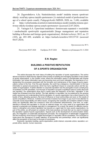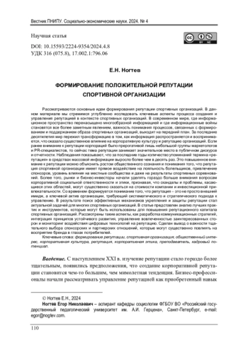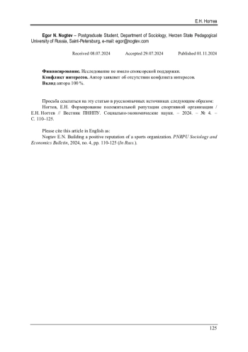 Рассматриваются основные идеи формирования репутации спортивных организаций. В данном материале мы стремимся углубленно исследовать ключевые аспекты процесса создания и управления репутацией в контексте спортивных организаций. В современном мире, где информационное пространство перенасыщено многообразной информацией и где информационные войны становятся все более заметным явлением, важность понимания процессов, связанных с формированием и поддержанием образа спортивных организаций, выходит на передний план. За последние десятилетия мир пережил трансформацию в том, как информация распространяется и воспринимается, что оказало существенное влияние на корпоративную культуру и репутацию организаций. Если ранее внимание к репутации корпораций было прерогативой лишь небольшой группы маркетологов и PR-специалистов, то сейчас тема репутации занимает значительное место в публичном дискурсе и отчетности. Наблюдения показывают, что за последние годы количество упоминаний термина «репутация» в средствах массовой информации выросло более чем в десять раз. Это повышенное внимание к репутации можно объяснить ростом общественного сознания и понимания того, что репутация спортивной организации имеет прямое воздействие на лояльность болельщиков, привлечение спонсоров, уровень влияния на местные сообщества и даже на результаты спортивных соревнований. Более того, рынки и бизнес-инвесторы начали уделять гораздо больше внимания вопросам корпоративной социальной ответственности и этики, признавая, что скандалы и проблемы, касающиеся этих областей, могут существенно сказаться на стоимости компании и инвестиционной привлекательности. Со временем формируется понимание того, что репутация - это не просто внешний имидж, а ключевой актив организации, требующий систематического и стратегического подхода к управлению. В результате поиск эффективных механизмов укрепления и защиты репутации стал актуальной задачей для многих спортивных организаций. В статье представлен анализ лучших практик и инструментов, которые могут быть использованы для повышения репутационного капитала спортивных организаций. Рассмотрены такие аспекты, как разработка коммуникационных стратегий, интеграция принципов устойчивого развития, управление вовлеченностью заинтересованных сторон и мониторинг воздействия цифровых технологий на репутацию. Сделан вывод о важности тщательного выбора спонсорских и партнерских отношений, которые могут существенно повлиять на восприятие бренда в глазах потребителей.