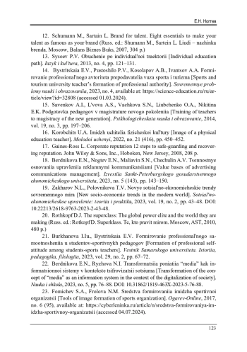 21. Бурханова, И.Ю. Формирование профессионального самоотношения у студентов-спортивных педагогов / И.Ю. Бурханова, Е.В. Быстрицкая // Вестник Самарского университета. История, педагогика, филология. - 2023. - Т. 29, № 2. - С. 67-92. EDN: XEUUCS