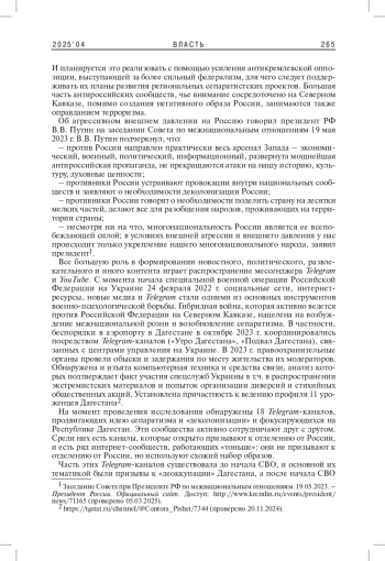 В статье автор анализирует ряд информационных каналов таких сервисов, как Telegram и YouTube, ориентированных на Республику Дагестан, деятельность которых направлена на разжигание межнациональной и межконфессиональной розни, сепаратистских и националистических настроений. Целью таких информационных каналов является формирование негативного образа России и образа колонизированных народов Дагестана.