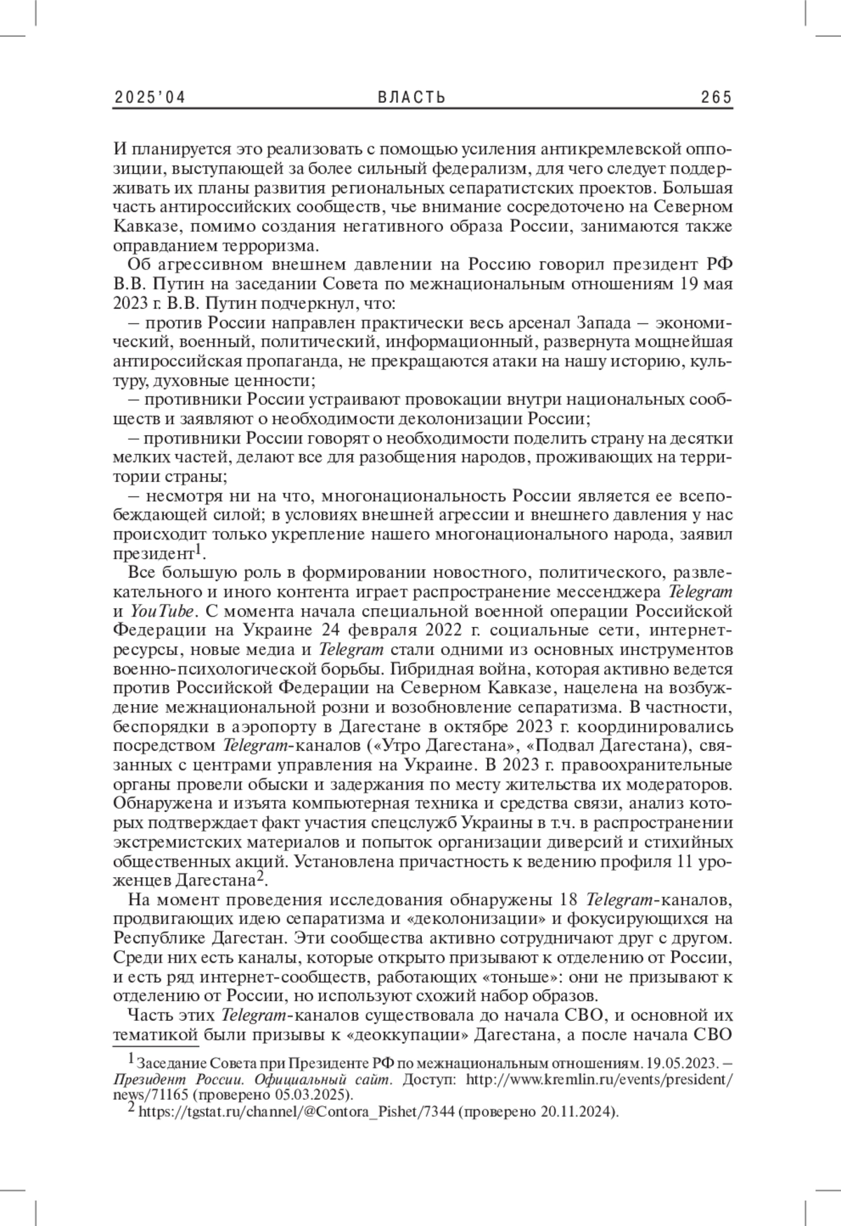 2. Габараева М.Р. 2024. Дискурс “деколонизации” в антироссийских telegram-каналах, ориентированных на Северный Кавказ (опыт контент-анализа). - Социологические исследования. № 8. С. 79-93. EDN: DKKBXS