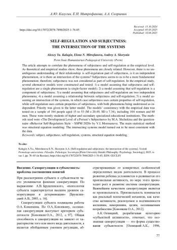 В статье на эмпирическом уровне предпринята попытка соотнести между собой феномены субъектности и саморегуляции. Как показывают теоретические и эмпирические исследования, данные феномены тесно связаны. Однако нет однозначного понимания их соотношения: является ли саморегуляция частью субъектности, представляет ли самостоятельный феномен или имеет место пересечение систем? При этом субъектность видится нам как более фундаментальное явление, поэтому субъектность не рассматривалась как часть саморегуляции. В эмпирическом исследовании строились и тестировались несколько альтернативных моделей: 1) модель, предполагающая, что субъектность и саморегуляция представляют единый феномен (однофакторная); 2) модель, предполагающая, что саморегуляция является компонентом субъектности; 3) модель, предполагающая, что субъектность и саморегуляция - два независимых феномена; 4) модель, предполагающая взаимосвязь субъектности и саморегуляции; 5) модель, предполагающая пересечение систем, при котором субъектность использует отдельные свойства саморегуляции, а саморегуляция использует отдельные свойства субъектности, при этом оба феномена понимаются как самостоятельные. Приоритет отдавался последней модели. Проверка согласованности моделей эмпирическим данным осуществлялась на выборке 184 чел. в возрасте от 15 до 53 лет (M = 20.49, SD = 7.34), из них 104 женщин и 80 мужчин. Преимущественно это были студенты вузов и ссузов. Использовались методики «Уровень развития субъектности личности» (УРСЛ) М. А. Щукиной и опросник В. И. Моросановой «Стиль саморегуляции поведения - ССПМ 2020». Основным статистическим методом было моделирование структурными уравнениями. Наиболее согласованной с данными оказалась модель пересекающихся систем.