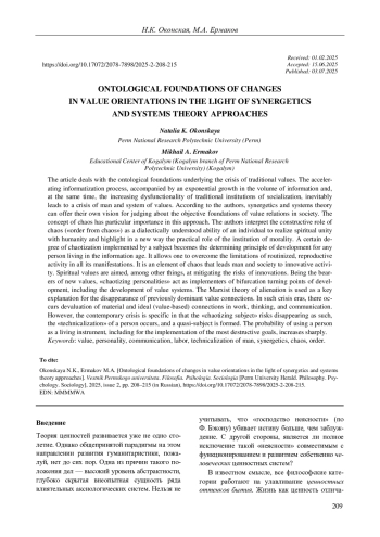 Статья: ОНТОЛОГИЧЕСКИЕ ОСНОВАНИЯ ИЗМЕНЕНИЙ ЦЕННОСТНЫХ ОРИЕНТИРОВ В СВЕТЕ ПОДХОДОВ СИНЕРГЕТИКИ И ОБЩЕЙ ТЕОРИИ СИСТЕМ (2025)