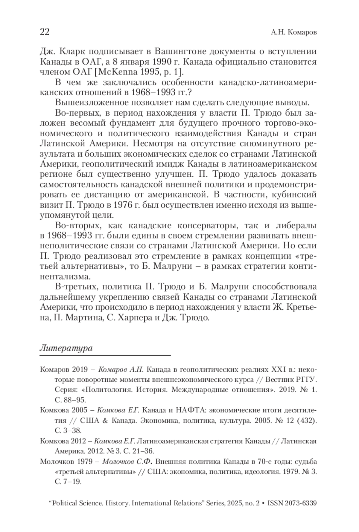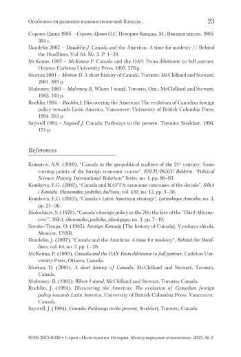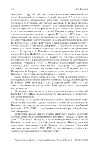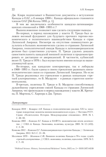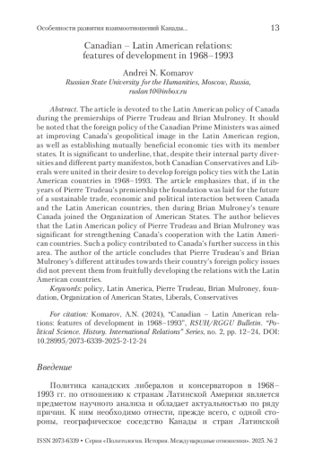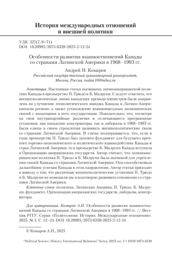 Настоящая статья посвящена латиноамериканской политике Канады в премьерство П. Трюдо и Б. Малруни. Следует отметить, что внешнеполитическая линия канадских премьер-министров была направлена на улучшение геополитического имиджа Канады в Латино-Американском регионе, а также установление взаимовыгодных экономических связей с входящими в него государствами. Показательно, что, несмотря на свои внутрипартийные различия и отличающиеся программные установки, как канадские консерваторы, так и либералы в 1968–1993 гг. были едины в своем стремлении развивать внешнеполитические связи со странами Латинской Америки. В статье подчеркивается, что, если в годы премьерства П. Трюдо был заложен фундамент для будущего прочного торгово-экономического и политического взаимодействия Канады и стран Латинской Америки, то в премьерство Б. Малруни Канада вступила в Организацию американских государств. Автор считает, что латиноамериканская политика П. Трюдо и Б. Малруни была значимой для укрепления связей Канады со странами Латинской Америки. Она способствовала дальнейшим успехам Канады в этом направлении. Автор статьи приходит к выводу о том, что различные внешнеполитические установки П. Трюдо и Б. Малруни не помешали им плодотворно развивать отношения со странами Латинской Америки.