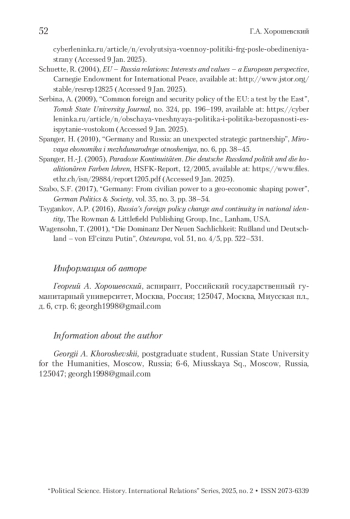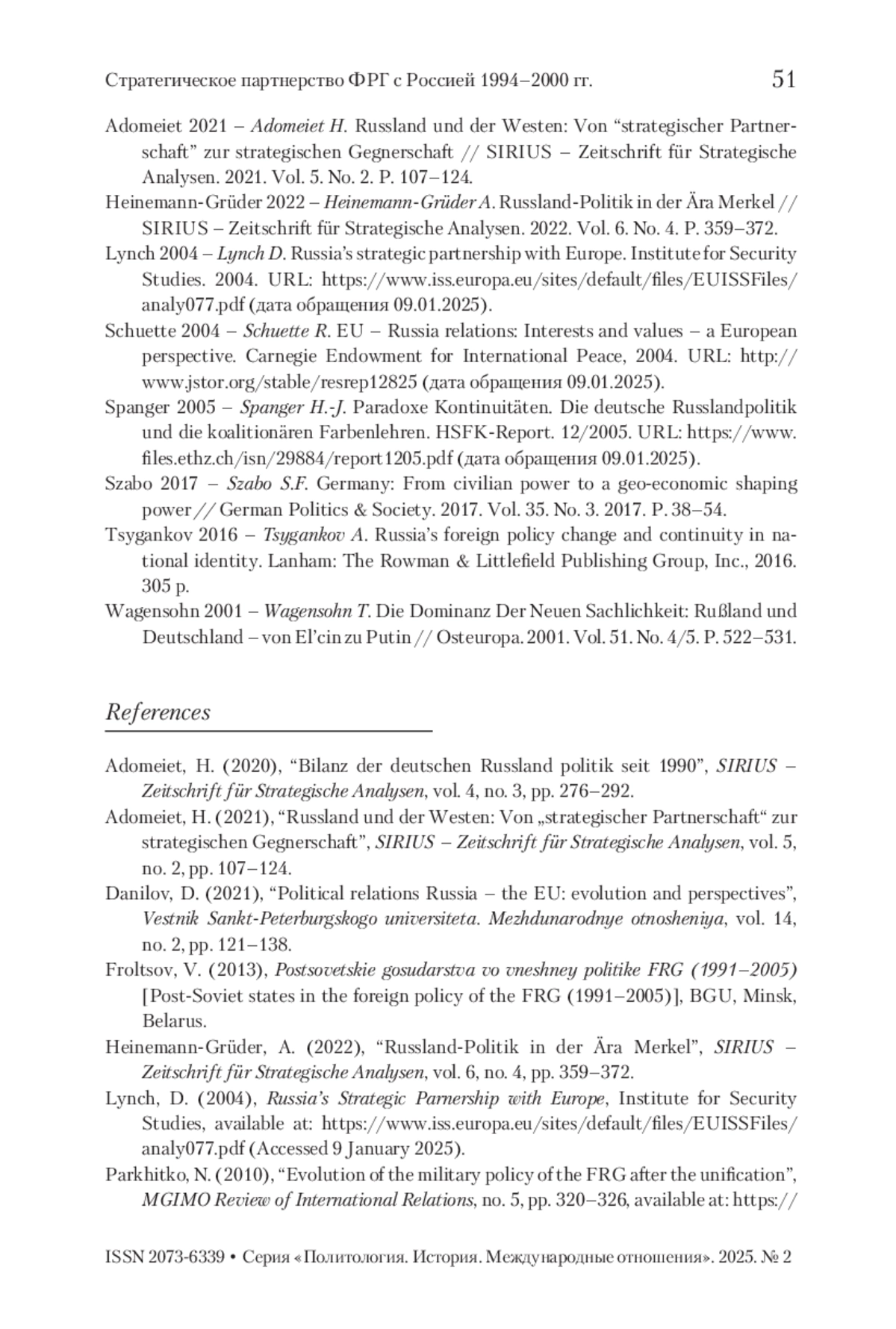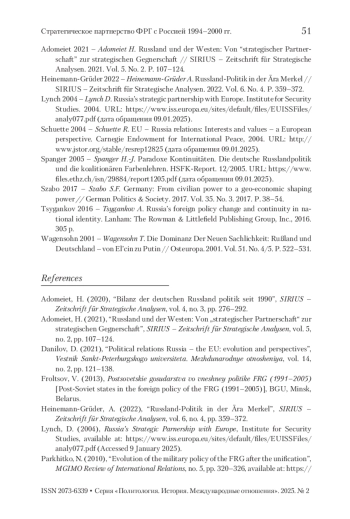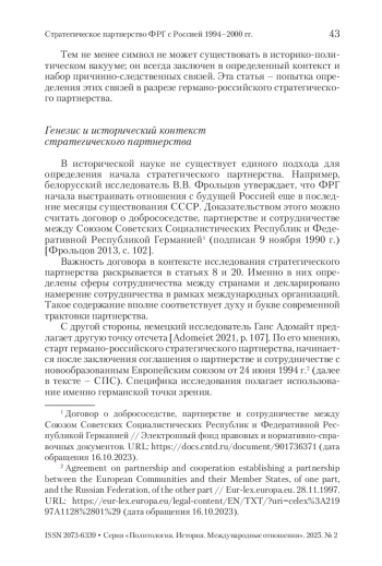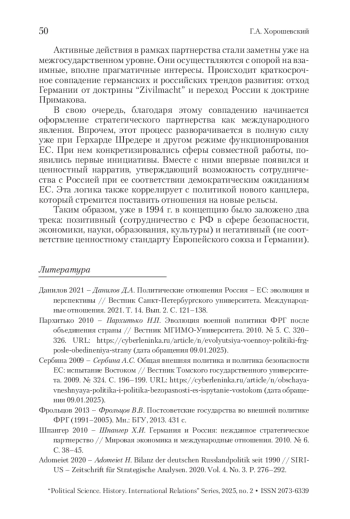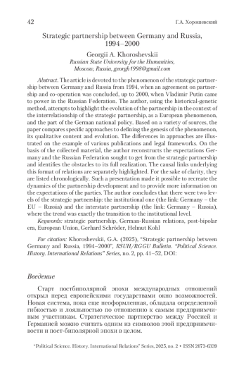Статья посвящена феномену стратегического партнерства ФРГ и РФ с 1994 г., когда было заключено соглашение о партнерстве и сотрудничестве по 2000 г., когда к власти в РФ приходит Владимир Путин. Автор, используя историко-генетический метод, предпринимает попытку осветить эволюцию партнерства в контексте взаимосвязи стратегического партнерства как европейского явления и части немецкой национальной политики. На основе разнообразных источников в работе сравниваются подходы к определению генезиса явления, к его качественному содержанию и эволюции. Различия подходов продемонстрированы на примере различных публикаций и нормативно-правовой базы. На основе собранных материалов автор реконструирует ожидания ФРГ и РФ от стратегического партнерства, обозначает препятствия для его реализации в полной мере. Отдельно выделены причинно-следственные связи, лежащие в основе такого формата отношений. Для наглядности они изложены в хронологическом порядке. Такое изложение позволило воссоздать динамику развития партнерства и полнее осветить ожидания сторон. Автор приходит к выводу о существовании двух уровней стратегического партнерства: институционального (связь: Германия – ЕС – РФ) и межгосударственного (связь: ФРГ – РФ), где трендом является именно переход к институциональному уровню.