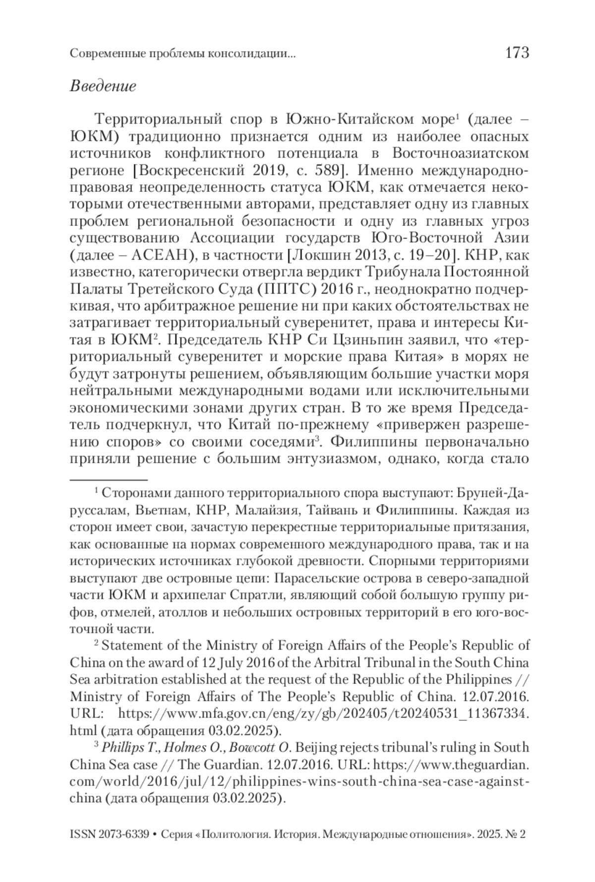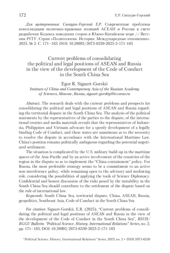 В исследовании анализируются современные проблемы и перспективы консолидации политико-правовых позиций АСЕАН и России в отношении территориального спора в Южно-Китайском море. На основе анализа совокупности материалов политических заявлений представителей сторон спора, международных договоров и материалов СМИ выявлено, что представители Индонезии, Филиппин и Вьетнама указывают на необходимость скорейшей выработки юридически обязательного Кодекса поведения сторон в Южно-Китайском море, будучи единогласными в необходимости урегулирования спора в соответствии с существующими нормами международного морского права. Позиция Китая остается политически неоднозначной и амбивалентной в отношении потенциального договорного урегулирования.