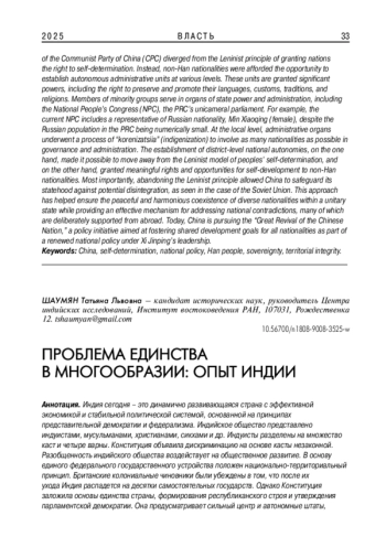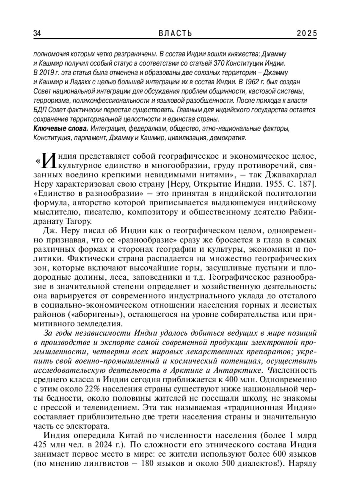 Индия сегодня - это динамично развивающаяся страна с эффективной экономикой и стабильной политической системой, основанной на принципах представительной демократии и федерализма. Индийское общество представлено индуистами, мусульманами, христианами, сикхами и др. Индуисты разделены на множество каст и четыре варны. Конституция объявила дискриминацию на основе касты незаконной. Разобщенность индийского общества воздействует на общественное развитие. В основу единого федерального государственного устройства положен национально-территориальный принцип. Британские колониальные чиновники были убеждены в том, что после их ухода Индия распадется на десятки самостоятельных государств. Однако Конституция заложила основы единства страны, формирования республиканского строя и утверждения парламентской демократии. Она предусматривает сильный центр и автономные штаты, полномочия которых четко разграничены. В состав Индии вошли княжества; Джамму и Кашмир получил особый статус в соответствии со статьей 370 Конституции Индии. В 2019 г. эта статья была отменена и образованы две союзных территории - Джамму и Кашмир и Ладакх с целью большей интеграции их в состав Индии. В 1962 г. был создан Совет национальной интеграции для обсуждения проблем общинности, кастовой системы, терроризма, поликонфессиональности и языковой разобщенности. После прихода к власти БДП Совет фактически перестал существовать. Главным для индийского государства остается сохранение территориальной целостности и единства страны.