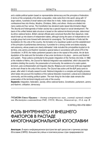 В науке и информационном пространстве идёт дискуссия о причинах распада Югославии (СФРЮ). Большинство учёных и политиков разных стран придерживаются версии о большой роли внутренннего фактора, в том числе о вине сербов за возникновение конфликтной ситуации в СФРЮ в конце 80-х годов. Автор статьи приходит к выводу, что международный фактор играл определяющую роль в развале федерации. Именно он поддерживал выход республик из состава федерации, вёл информационную войну, подтасовывал решения международных организаций, принуждал к антисербским действиям, разжигал националистические настроения.