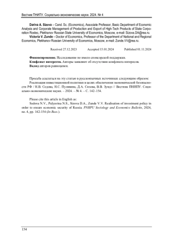 Инвестиционная политика играет важную роль в обеспечении национальной безопасности России в условиях санкционных ограничений. Это связано с тем, что ограничения, налагаемые на экономику страны, могут привести к сужению доступа к финансовым ресурсам и инвестициям, а также нарушению экономических связей с другими государствами. Ввиду этого в части сферы инвестиций в государстве формируются национальные интересы и стратегические национальные приоритеты, которые закрепляет Указ Президента No400 «О стратегии национальной безопасности Российской Федерации» [1]. В положениях акта не выделяется обособленный интерес или стратегический приоритет государства в достижении безопасности в области инвестиций, но данный контекст можно выделить в национальном интересе об «устойчивом развитии российской экономики на новой технологической основе», а также в национальном стратегическом приоритете «экономическая безопасность», «информационная безопасность», «научно-технологическое развитие» [2]. Таким образом, в рамках национальных интересов и приоритетов (в области национальной безопасности) формируется экономическая безопасность [3], частью которой становится сфера инвестиций