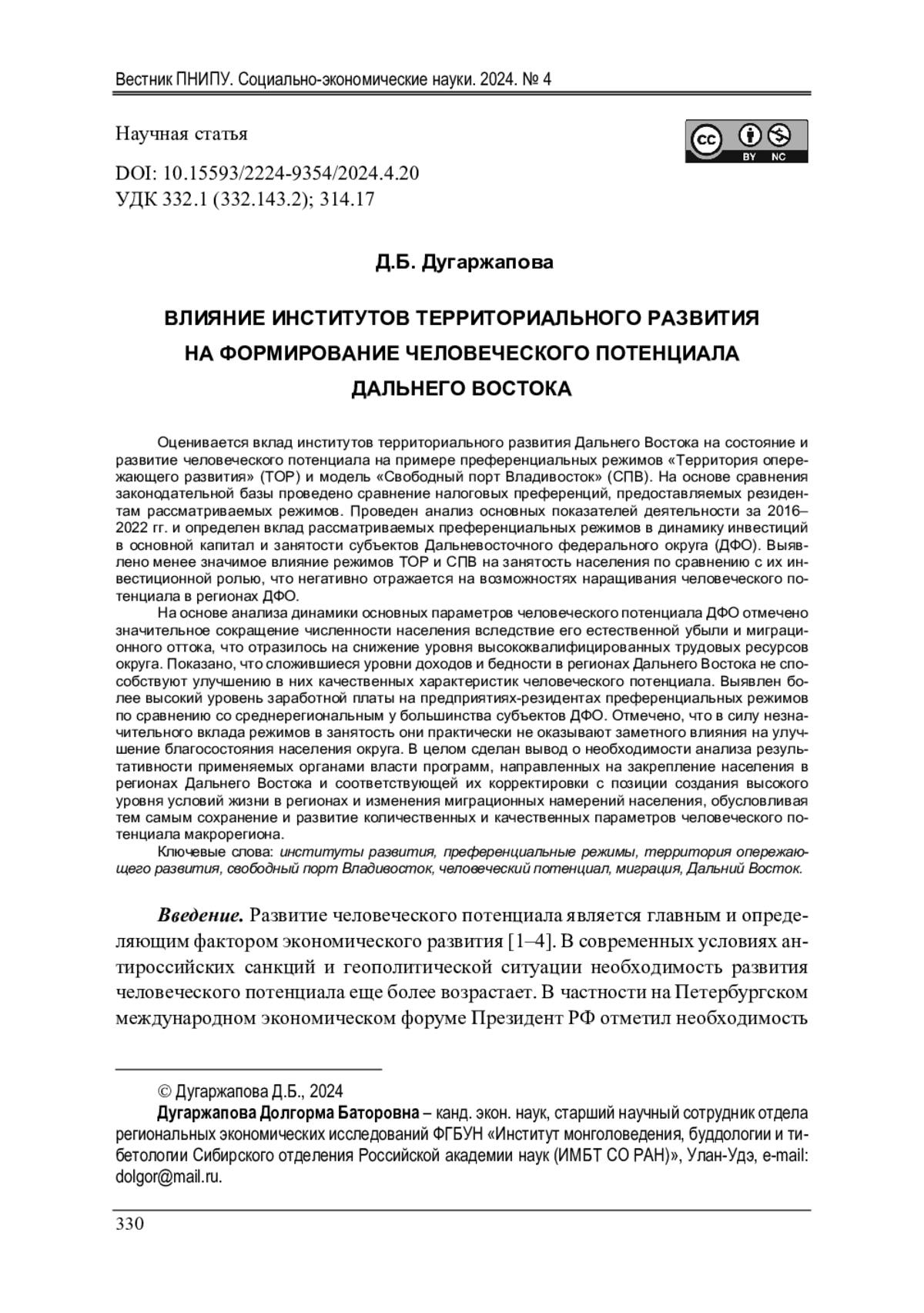 ДУГАРЖАПОВА Д. Б. ВЛИЯНИЕ ИНСТИТУТОВ ТЕРРИТОРИАЛЬНОГО РАЗВИТИЯ НА ФОРМИРОВАНИЕ ЧЕЛОВЕЧЕСКОГО ПОТЕНЦИАЛА ДАЛЬНЕГО ВОСТОКА // ВЕСТНИК ПЕРМСКОГО НАЦИОНАЛЬНОГО ИССЛЕДОВАТЕЛЬСКОГО ПОЛИТЕХНИЧЕСКОГО УНИВЕРСИТЕТА. СОЦИАЛЬНО-ЭКОНОМИЧЕСКИЕ НАУКИ. 2024. № 4