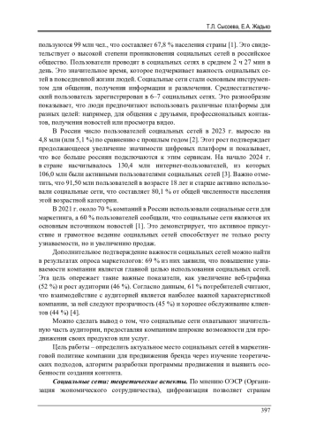 Введение. Актуальность социальных сетей в продвижении бренда является значимым результатом развития цифровизации. Аналитики бизнес-издания Forbes заявляют, что число пользователей социальных сетей по всему миру составляет более 4.9 млрд чел. В России, на январь 2023 г., социальными сетями пользуются 99 млн чел., что составляет 67,8 % населения страны [1]. Это свидетельствует о высокой степени проникновения социальных сетей в российское общество. Пользователи проводят в социальных сетях в среднем 2 ч 27 мин в день. Это значительное время, которое подчеркивает важность социальных сетей в повседневной жизни людей. Социальные сети стали основным инструментом для общения, получения информации и развлечения. Среднестатистический пользователь зарегистрирован в 6–7 социальных сетях. Это разнообразие показывает, что люди предпочитают использовать различные платформы для разных целей: например, для общения с друзьями, профессиональных контактов, получения новостей или просмотра видео