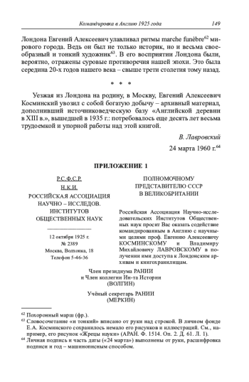 Мы выехали из Москвы 14 октября 1925 г. Вот документ, полученный за два дня до отъезда – за подписью В. П. Волгина3 (уже значительно выцветшей!), – 12 октября 1925 г. Волхонка 18, РАНИОН. Это была направленная полномочному послу СССР в Великобритании4 просьба о содействии в получении доступа к лондонским архивам и книгохранилищам* 5