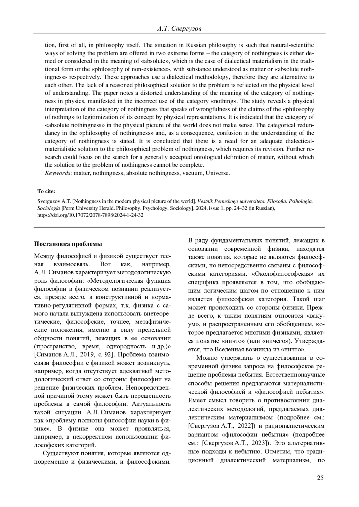 8. Свергузов А.Т. О возможности рациональной концепции абсолютного небытия // Вестник Пермского университета. Философия. Психология. Социология. 2023. Вып. 2. С. 198-206. DOI: 10.17072/2078-7898/2023-2-198-206 EDN: QYRHXN