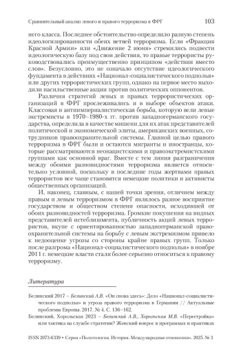 Статья посвящена сравнительному анализу правого и левого терроризма в ФРГ на основе выделенных критериев (причины возникновения, социальный состав, тактика, связи с другими группами и т. д.). Отмечается, что в своем становлении обе разновидности терроризма прошли три стадии – общественный раскол, радикализация протестного движения и появление в ее рядах группы, готовой перейти к вооруженной борьбе, уход в подполье. И для левого, и для правого терроризма было характерно отрицание либеральной демократии и позиционирования себя в качестве авангарда экстремистских сил, выступающих против государства. Вместе с тем детальный анализ показывает, что между правыми и левыми террористическими организациями есть существенные отличия, продиктованные как идеологией, так и историческим контекстом, в котором они действовали. К наиболее существенным из них следует отнести различный социальный состав, объекты атаки, коммуникацию, формы организации и др. Также отмечается, что правый терроризм на протяжении долгого времени был недооценен властями, что имело в будущем фатальные последствия.