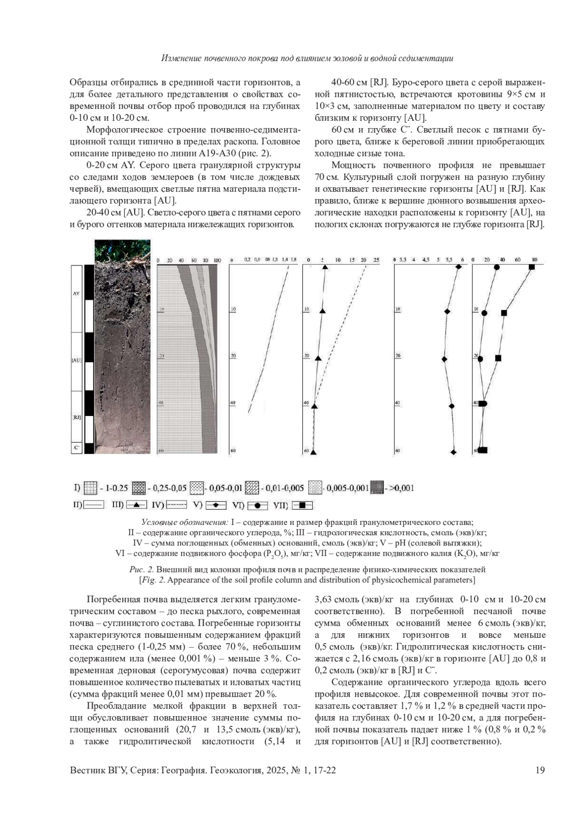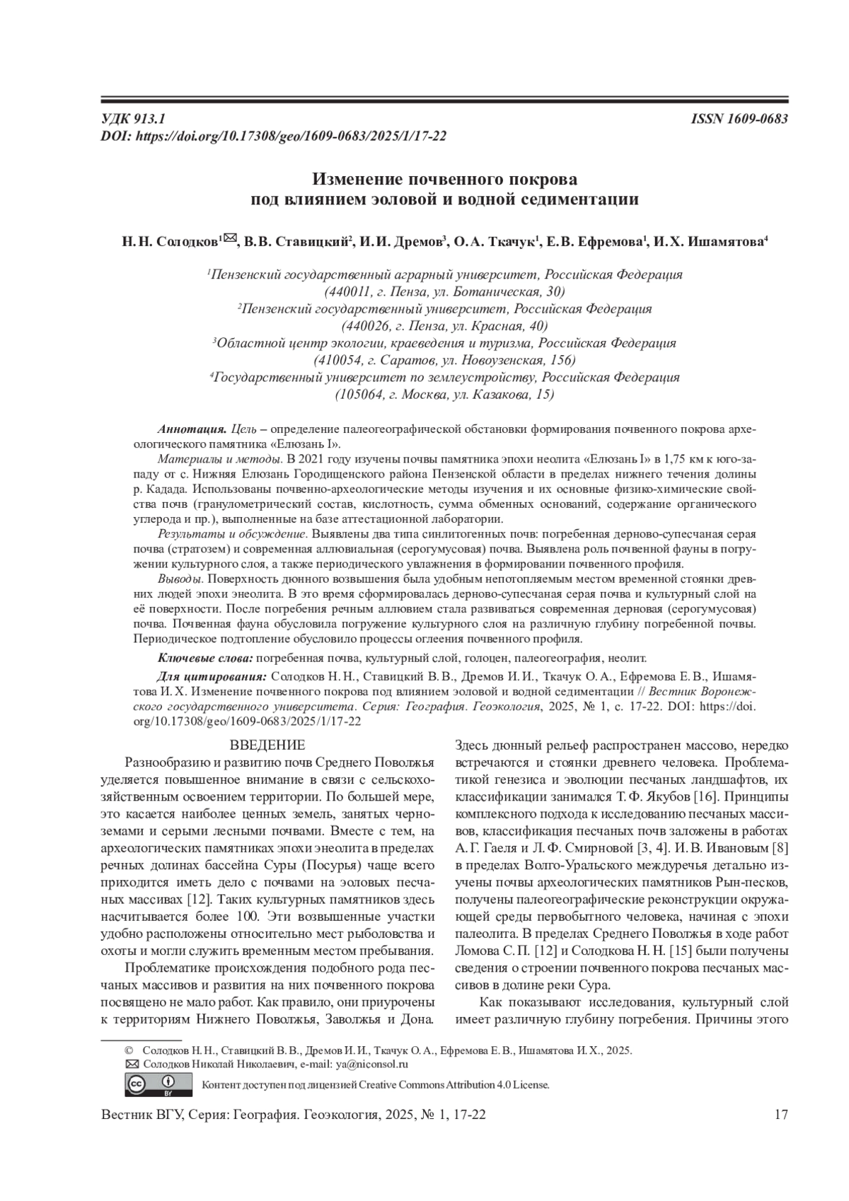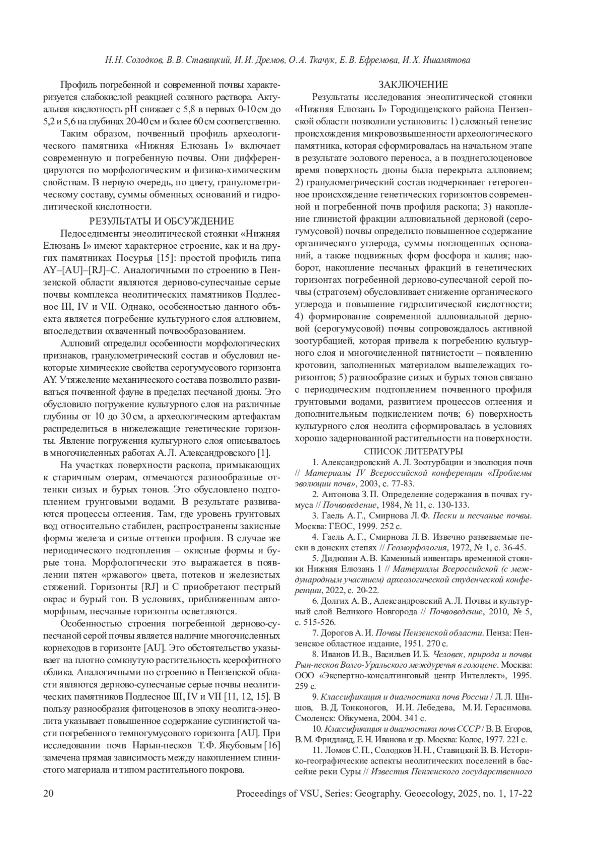Цель - определение палеогеографической обстановки формирования почвенного покрова археологического памятника «Елюзань I». Материалы и методы. В 2021 году изучены почвы памятника эпохи неолита «Елюзань I» в 1,75 км к юго-западу от с. Нижняя Елюзань Городищенского района Пензенской области в пределах нижнего течения долины р. Кадада. Использованы почвенно-археологические методы изучения и их основные физико-химические свойства почв (гранулометрический состав, кислотность, сумма обменных оснований, содержание органического углерода и пр.), выполненные на базе аттестационной лаборатории. Результаты и обсуждение. Выявлены два типа синлитогенных почв: погребенная дерново-супесчаная серая почва (стратозем) и современная аллювиальная (серогумусовая) почва. Выявлена роль почвенной фауны в погружении культурного слоя, а также периодического увлажнения в формировании почвенного профиля. Выводы. Поверхность дюнного возвышения была удобным непотопляемым местом временной стоянки древних людей эпохи энеолита. В это время сформировалась дерново-супесчаная серая почва и культурный слой на её поверхности. После погребения речным аллювием стала развиваться современная дерновая (серогумусовая) почва. Почвенная фауна обусловила погружение культурного слоя на различную глубину погребенной почвы. Периодическое подтопление обусловило процессы оглеения почвенного профиля.