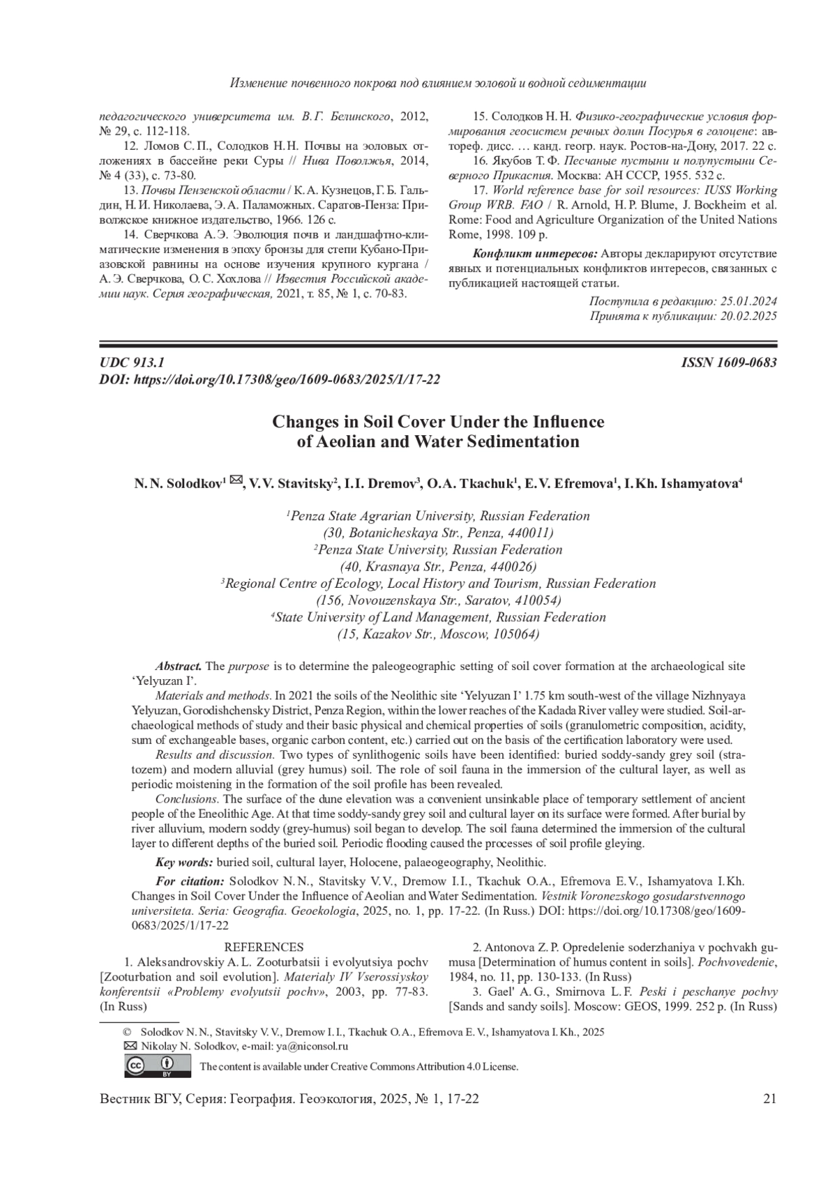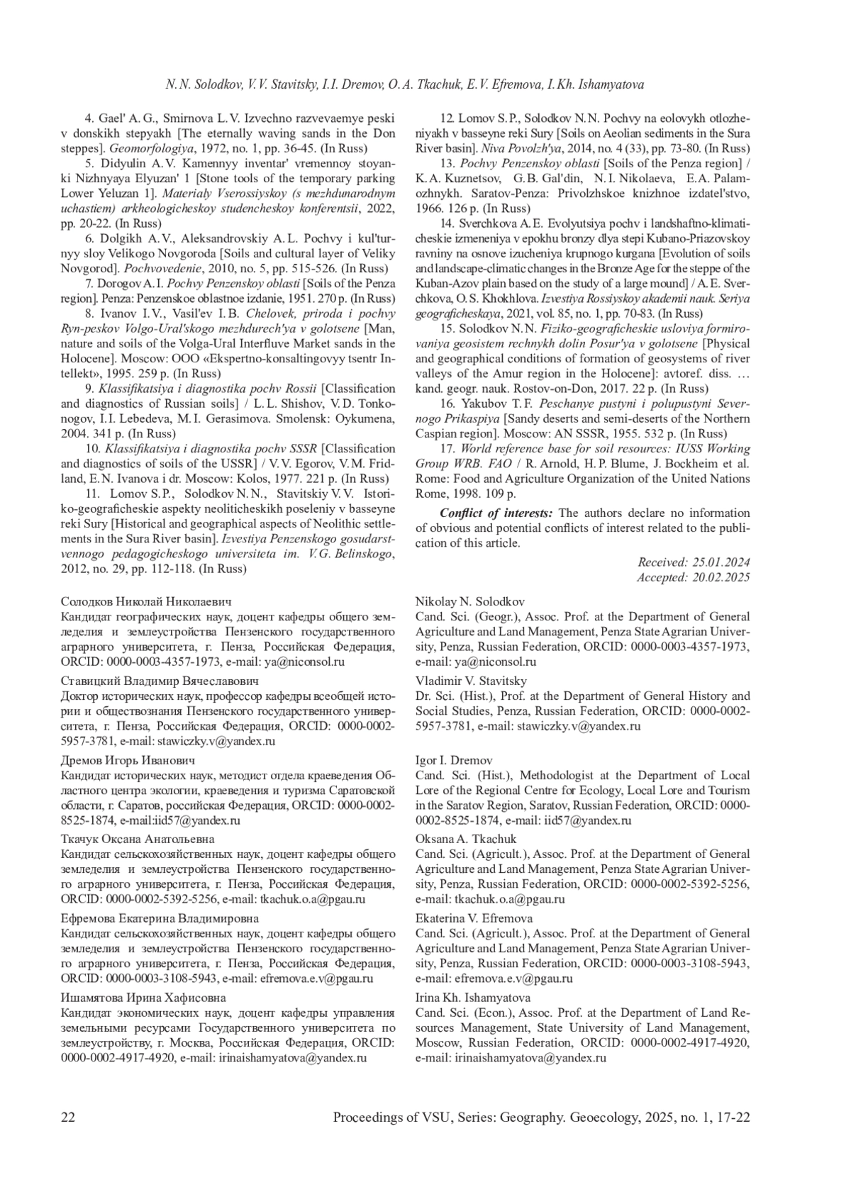 15. 	Солодков Н.Н. Физико-географические условия формирования геосистем речных долин Посурья в голоцене’, автореф. дисс.. канд. геогр. наук. Ростов-на-Дону, 2017. 22 с. EDN: ZQEEFZ