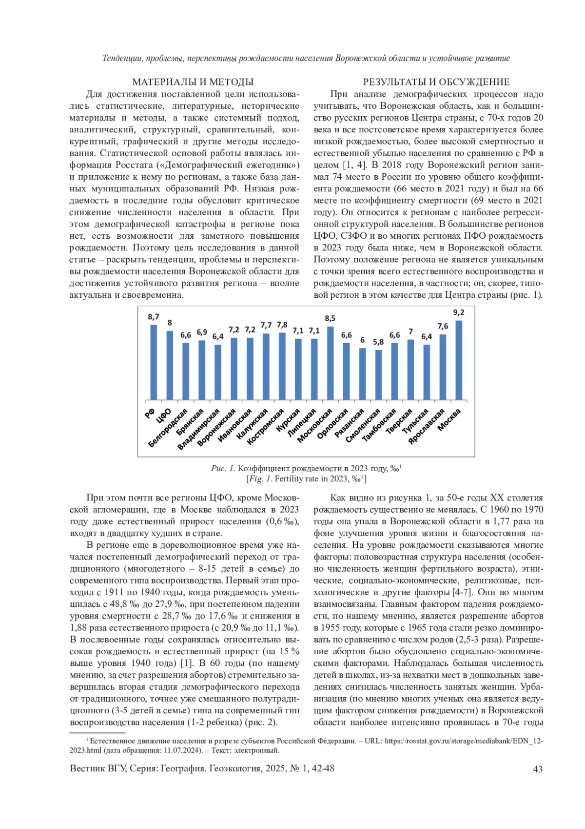 Цель - рассмотреть тенденции, проблемы, перспективы рождаемости Воронежской области и возможности устойчивого развития региона. В последние годы падение рождаемости обусловливает ухудшение демографических процессов, что в будущем приведет к значительному сокращению трудовых ресурсов. Материалы и методы. Использовались статистический, литературный, исторический, системный, аналитический, структурный, сравнительный, конкурентный, графический и другие методы исследования. Статистической основой работы являлась информация Росстата («Демографический ежегодник») и приложение к нему по регионам, а также база данных муниципальных образований Российской Федерации. Результаты и обсуждение. Рассмотрены тенденции и трансформации рождаемости населения за многие годы. Воспроизводственный потенциал населения еще пока позволяет избежать демографической катастрофы в регионе. Выводы. Необходимо изменение демографической политики для развития многодетности. Нужна дифференцированная по регионам страны демографическая политика. В наибольшей степени необходимо стимулировать Центр России, который имеет самую регрессионную структуру населения.
