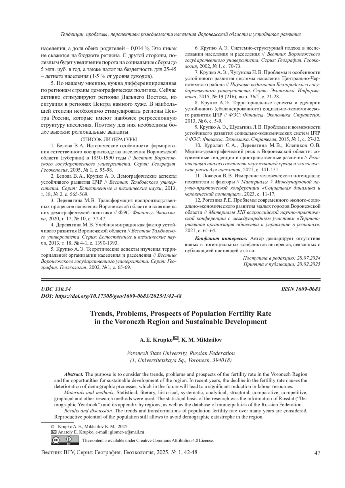 6. 	Крупко А.Э. Системно-структурный подход в исследовании населения и расселения // Вестник Воронежского государственного университета. Серия: География. Геоэкология, 2002, № 1, с. 70-73. EDN: TTPKTR