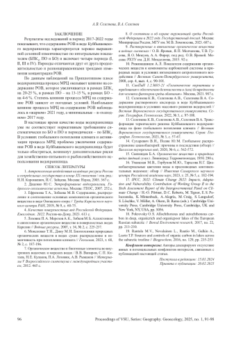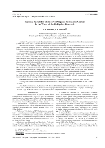 СЕЛЕЗНЕВА А. В., СЕЛЕЗНЕВ В. А. СЕЗОННАЯ ИЗМЕНЧИВОСТЬ СОДЕРЖАНИЯ РАСТВОРЕННЫХ ОРГАНИЧЕСКИХ ВЕЩЕСТВ В ВОДЕ КУЙБЫШЕВСКОГО ВОДОХРАНИЛИЩА // ВЕСТНИК ВОРОНЕЖСКОГО ГОСУДАРСТВЕННОГО УНИВЕРСИТЕТА. СЕРИЯ: ГЕОГРАФИЯ. ГЕОЭКОЛОГИЯ. 2025. № 1