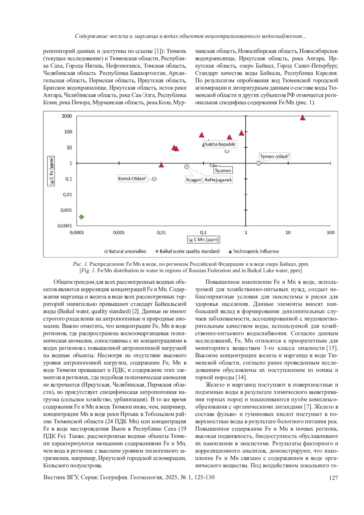 Общимтрендомдля всех рассмотренных водных объектов является корреляция концентраций Fe и Mn. Содержания марганца и железа в воде всех рассмотренных территорий значительно превышают стандарт Байкальской воды (Baikal water, quality standard) [2]. Данные не имеют строгого разделения на антропогенные и природные аномалии. Важно отметить, что концентрации Fe, Mn в воде регионов, где распространена железомарганцевая геохимическая аномалия, сопоставимы с их концентрациями в водах регионов с повышенной антропогенной нагрузкой на водные объекты.