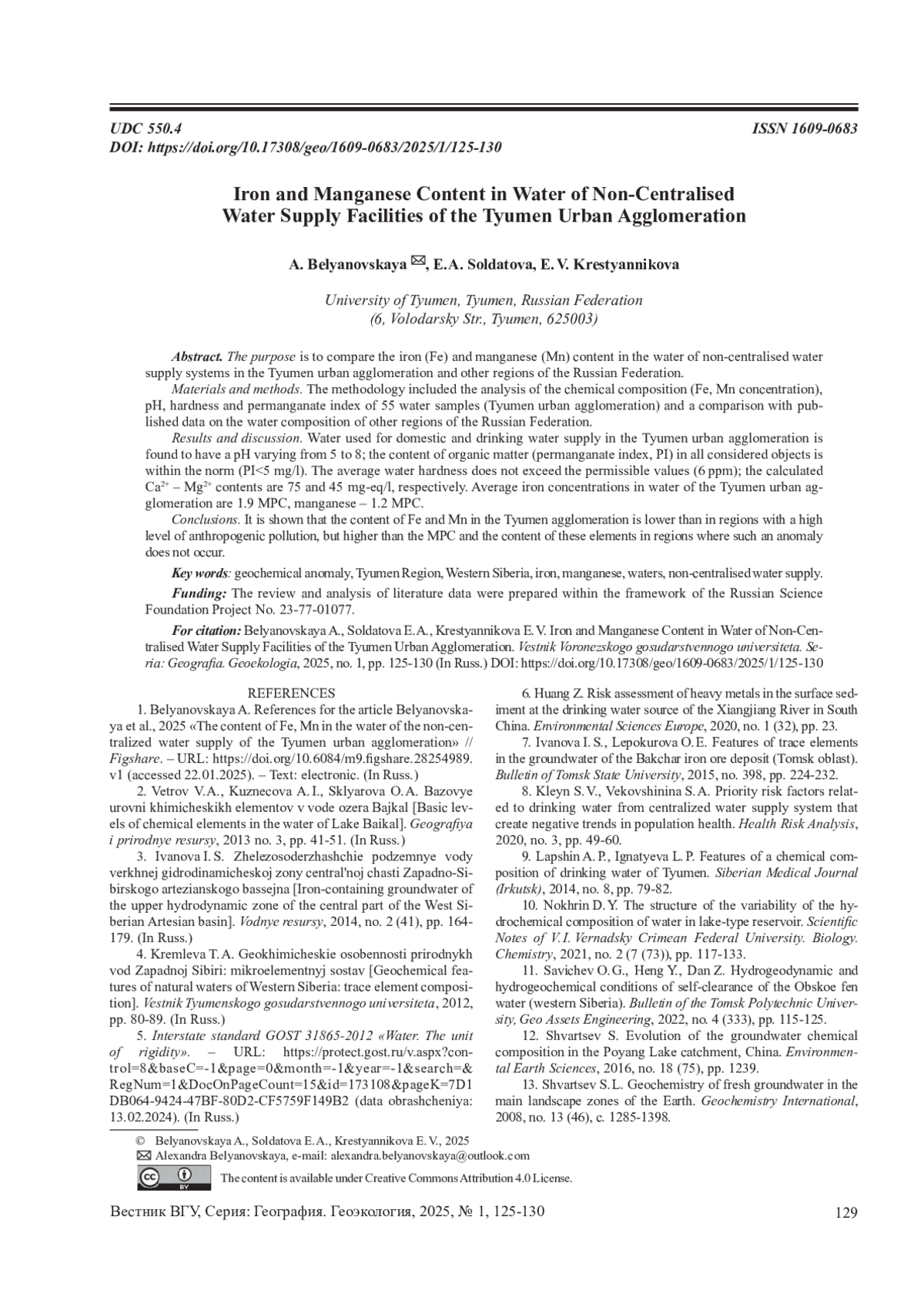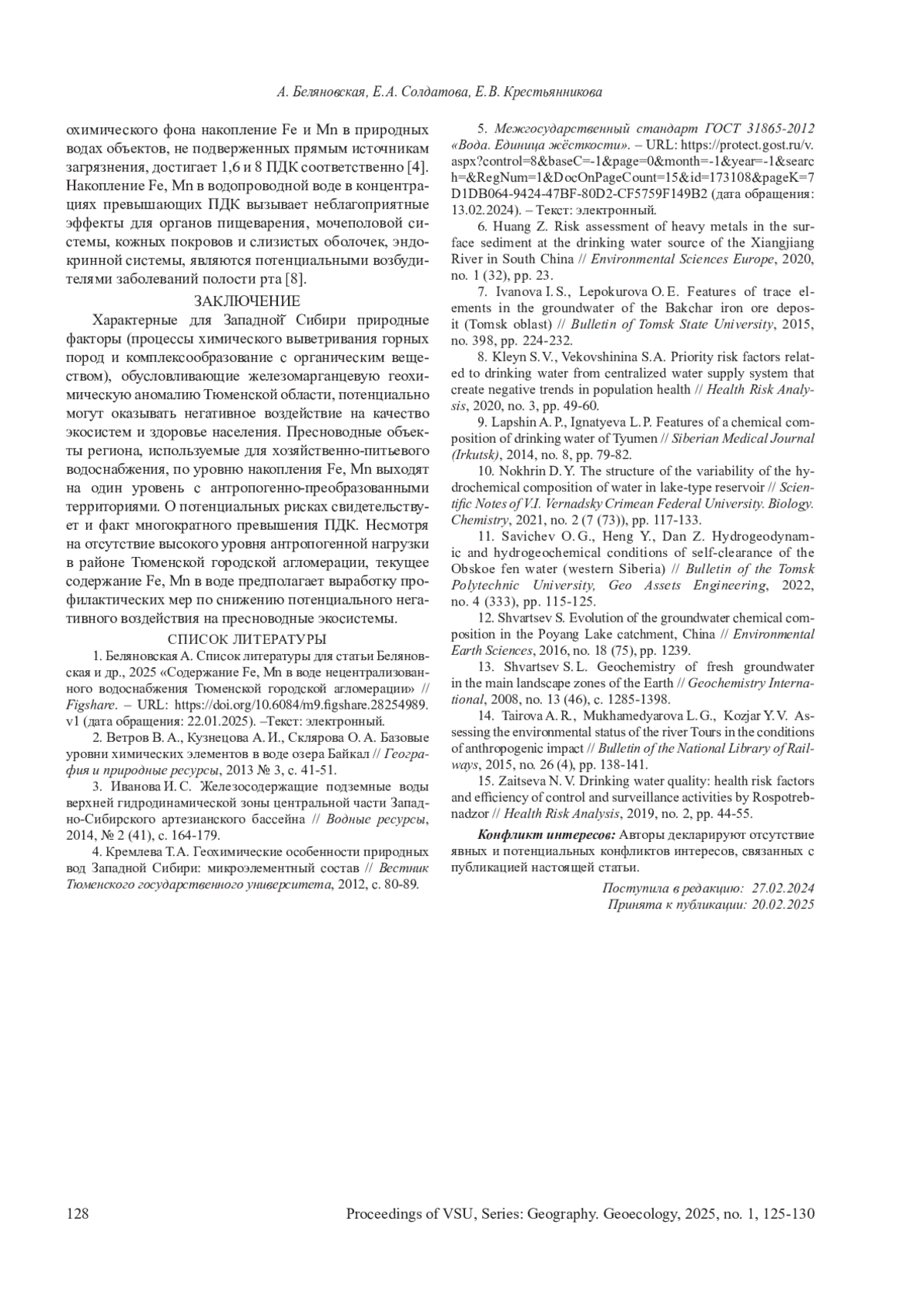 1. 	Беляновская А. Список литературы для статьи Беляновская и др., 2025 “Содержание Fe, Мп в воде нецентрализованного водоснабжения Тюменской городской агломерации” // Figshare. - URL: 10.6084/m9.figshare.28254989.vl (дата обращения: 22.01.2025). -Текст: электронный. DOI: 10.6084/m9.figshare.28254989.vl(