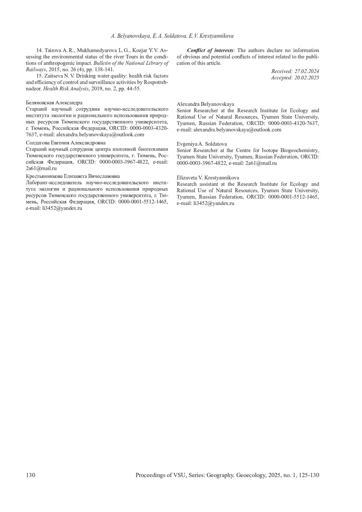 14. 	Tairova A.R., Mukhamedyarova L.G., Kozjar Y.V. Assessing the environmental status of the river Tours in the conditions of anthropogenic impact // Bulletin of the National Library ofRailways, 2015, no. 26 (4), pp. 138-141. EDN: XGSBPB