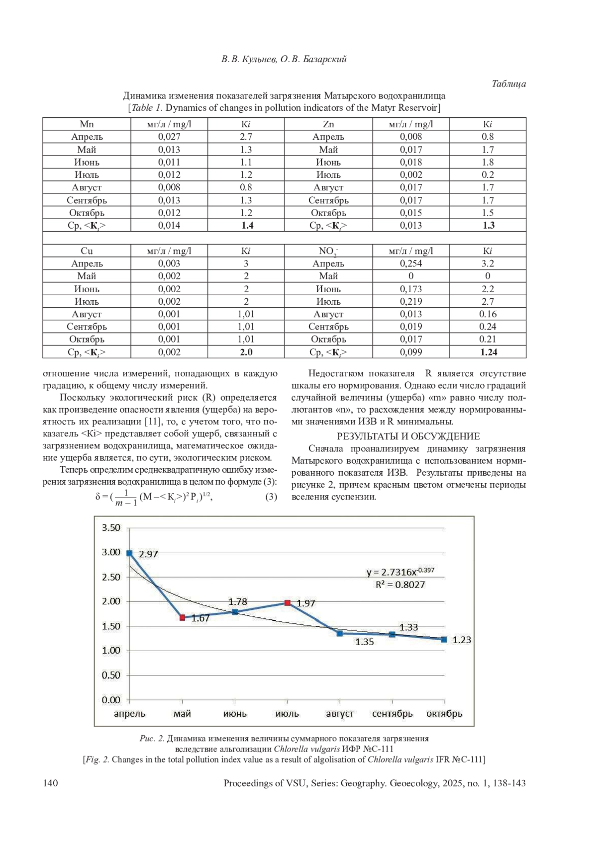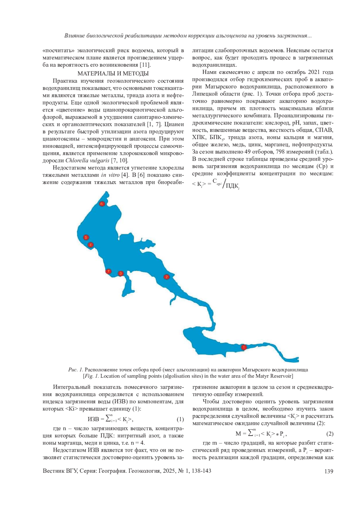 Практика изучения геоэкологического состояния водохранилищ показывает, что основными токсикантами являются тяжелые металлы, триада азота и нефтепродукты. Еще одной экологической проблемой является «цветение» воды цианопрокариотической альгофлорой, выражаемой в ухудшении санитарно-химических и органолептических показателей [1, 7]. Цианеи в результате быстрой утилизации азота продуцируют цианотоксины – микроцистин и анатоксин. При этом инновацией, интенсифицирующей процессы самоочищения, является применение хлорококковой микроводоросли Chlorella vulgaris [7, 10].