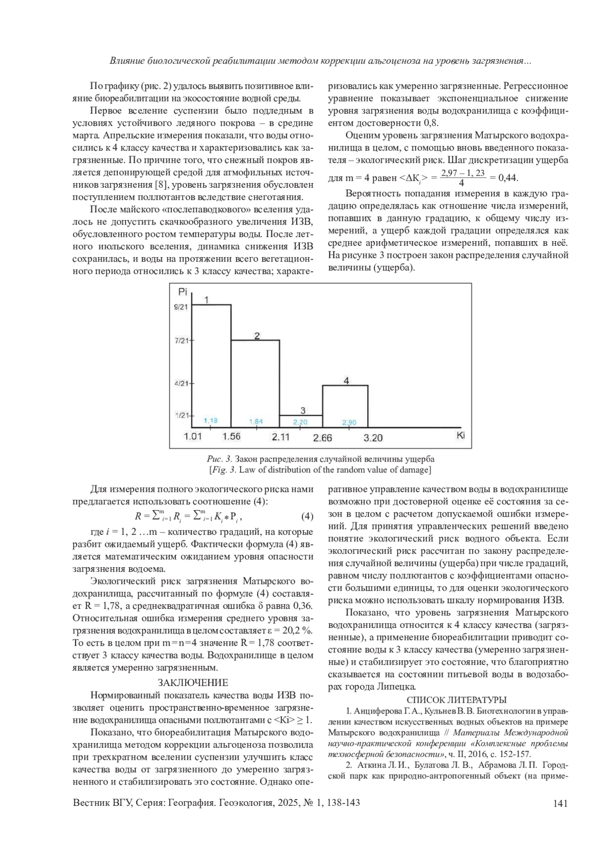 Цель - разработка методики оценки экологического риска водоемов, позволяющей оценить их сезонное загрязнение с определением допускаемых ошибок измерений. Материалы и методы. Проведены измерения состояния воды Матырского водохранилища (Липецкая область) с использованием стандартизированного индекса загрязнения воды и показано улучшение её качества за счет биологической реабилитации методом коррекции альгоценоза. Результаты и обсуждение. Развита методика измерения экологического риска состояния водоема, позволяющая оценить его состояние в целом за сезон. Найдены условия, при которых оценка экологического риска может быть произведена по нормированной шкале оценки индекса загрязнения воды. Выводы. Показано, что за счет проведения биореабилитации класс качества воды повысился от загрязненного до умеренно загрязненного и стабилизировался в этом состоянии. Оценка состояния воды водохранилища в целом за год по методике расчета экологического риска дала тот же среднесезонный результат - стабильное умеренное загрязнение.