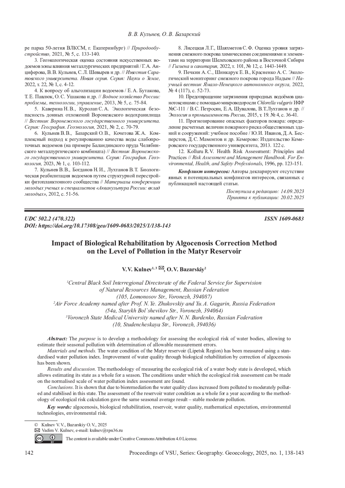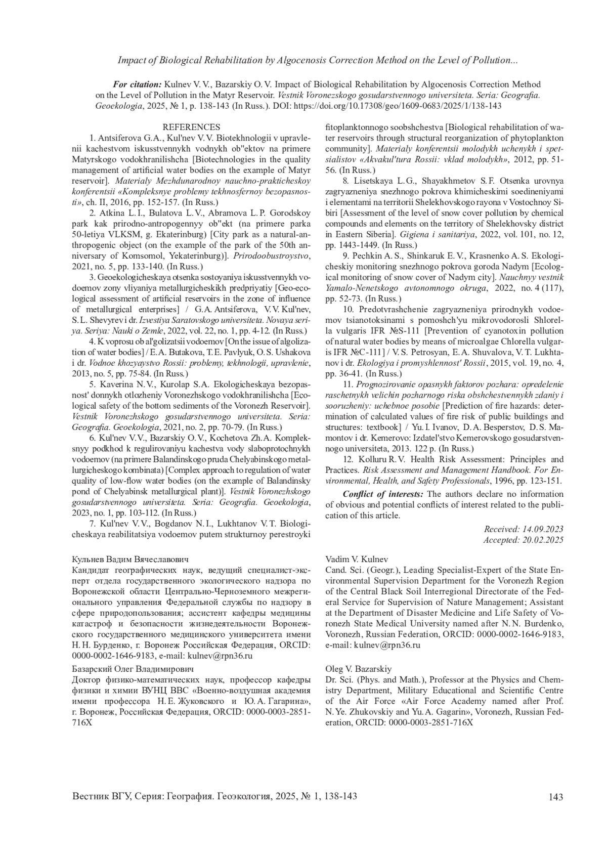 6. 	Кульнев В.В., Базарский О. В., Кочетова Ж.А. Комплексный подход к регулированию качества воды слабопроточных водоемов (на примере Баландинского пруда Челябинского металлургического комбината) // Вестник Воронежского государственного университета. Серия: География. Геоэкология, 2023, № 1, с. 103-112. EDN: IUNLBQ