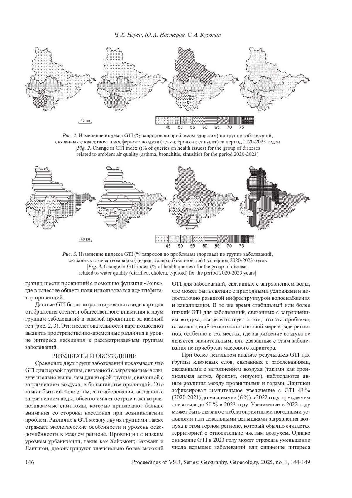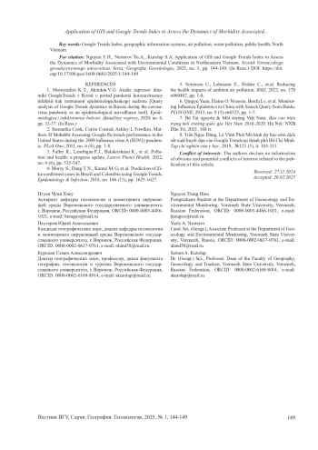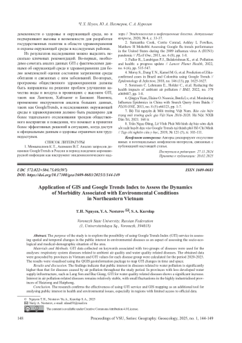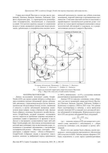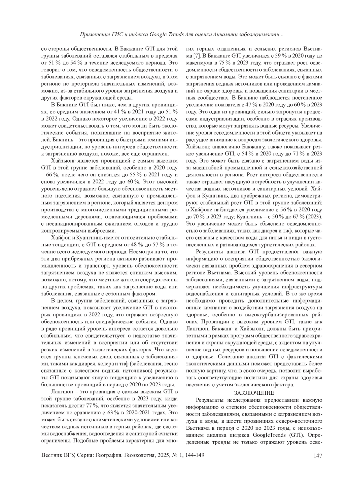 КУРОЛАП С. А., НЕСТЕРОВ Ю. А., НГУЕН Ч. Х. ПРИМЕНЕНИЕ ГИС И ИНДЕКСА GOOGLE TRENDS ДЛЯ ОЦЕНКИ ДИНАМИКИ ЗАБОЛЕВАЕМОСТИ, СВЯЗАННОЙ С ЭКОЛОГИЧЕСКИМИ УСЛОВИЯМИ НА ТЕРРИТОРИИ СЕВЕРО-ВОСТОЧНОГО ВЬЕТНАМА // ВЕСТНИК ВОРОНЕЖСКОГО ГОСУДАРСТВЕННОГО УНИВЕРСИТЕТА. СЕРИЯ: ГЕОГРАФИЯ. ГЕОЭКОЛОГИЯ. 2025. № 1