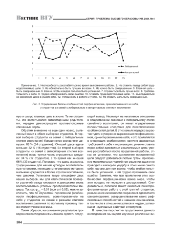 В представленном исследовании проведен сопоставительный анализ особенностей перфекционизма, ориентированного на себя, у студентов из семей с либеральным и авторитарным стилями семейного воспитания. Специфика исследования состоит в том, что в нем наряду с авторитарным изучался либеральный стиль семейного воспитания, которому в литературе уделено мало внимания в силу недостаточной его распространенности в российских семьях по сравнению с авторитарным и демократическим стилями. В результате авторами сделан вывод о том, что имеются статистически подтвержденные различия между показателями перфекционизма, ориентированного на себя, в выборках студентов из семей с либеральным и авторитарным стилями воспитания. Две выборки студентов отличаются по следующим характеристикам: воспитанные в авторитарных семьях не ставят перед собой трудно достижимые цели, не стремятся к максимальному приложению усилий, не стремятся быть совершенными, в то время как воспитанные в либеральных семьях студенты при постановке целей и стремлении к успеху демонстрируют адекватность в отношении и себя, и других, прилагая максимум усилий, не действуют в ущерб себе. Выявленные особенности студентов могут и должны учитываться при реализации индивидуального подхода к ним как в учебной, так и воспитательной работе.
