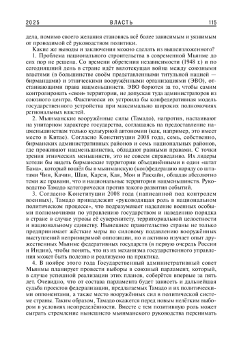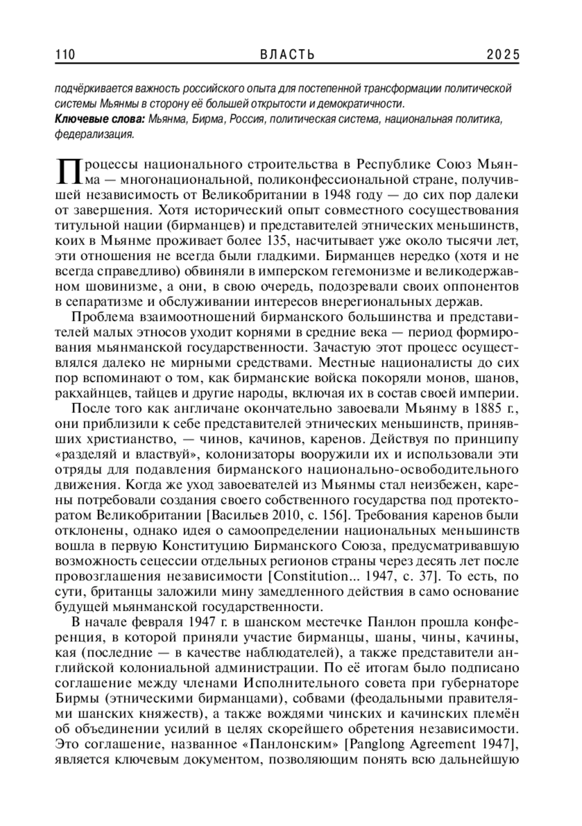 Статья раскрывает актуальную тему, связанную с перспективами установления мира и восстановления национального единства в Республике Союз Мьянма. В ней кратко освещаются истоки национальной политики Нейпьидо, обобщаются и систематизируются факторы, влияющие на процесс становления мьянманской государственности после обретения независимости, рассматриваются различия в подходах ведущих политических сил страны к проблеме федерализации и нациестроительства. Проводятся структурно- исторические параллели между российской и мьянманской политической традицией, подчёркивается важность российского опыта для постепенной трансформации политической системы Мьянмы в сторону её большей открытости и демократичности.