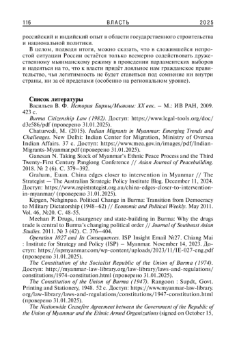 6. 	Kipgen, Nehginpao. Political Change in Burma: Transition from Democracy to Military Dictatorship (1948-62) // Economic and Political Weekly. May 2011. Vol. 46, №20. С. 48-55.