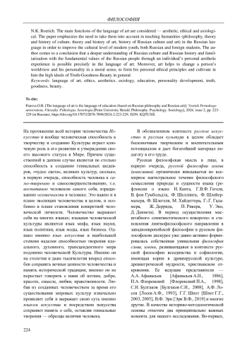 В статье обосновывается роль и значение языка искусства для воспитания человеческой личности. Автор опирается на достижения русской философии, русской педагогической мысли, русской эстетики и искусствоведения, отраженные в трудах В. С. Соловьева, Н. К. Рериха, Е. И. Рерих, Н. А. Бердяева, Н. О. Лосского, Д. С. Лихачева. Особое внимание уделяется художественно-эстетическому опыту, художественным открытиям и теоретическим работам В. В. Кандинского, К. Малевича, М. Шагала, Н. К. Рериха. Рассматриваются основные функции языка искусства - эстетическая, этическая и аксиологическая. Акцентируется необходимость их учета в преподавании гуманитарных дисциплин (философии, теории и истории культуры, теории и истории искусства, истории русской культуры и искусства) на русском языке с целью повышения культурного уровня современной молодежи, как русских, так и иностранных учащихся. Автор приходит к выводу, что более глубокое постижение русской культуры и русской истории и приобщение к основополагающим ценностям русского народа через личный эстетический опыт человека возможно именно на языке искусства. Более того, искусство способствует изменению мировоззрения человека и его личности в нравственном отношении, формированию его личных этических принципов и взращиванию в нем высоких идеалов Истины-Добра-Красоты в целом.
