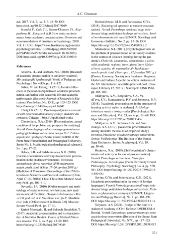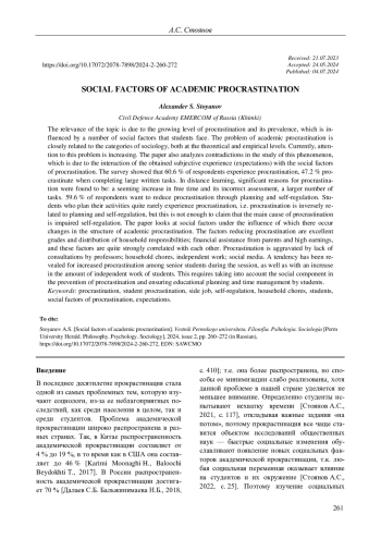 СТОЯНОВ А. С. СОЦИАЛЬНЫЕ ФАКТОРЫ АКАДЕМИЧЕСКОЙ ПРОКРАСТИНАЦИИ // ВЕСТНИК ПЕРМСКОГО УНИВЕРСИТЕТА. ФИЛОСОФИЯ. ПСИХОЛОГИЯ. СОЦИОЛОГИЯ. 2024. № 2