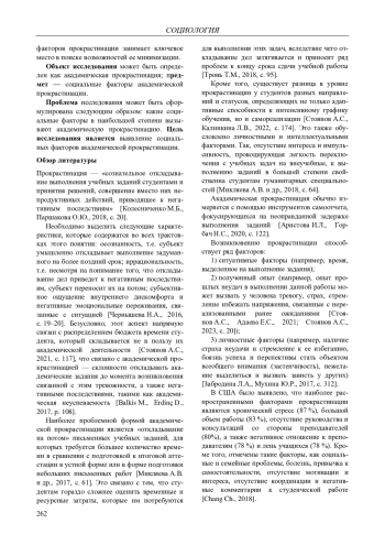 Актуальность темы обусловлена растущим уровнем прокрастинации и ее распространенности, на что оказывают влияние ряд социальных факторов, с которыми сталкиваются студенты. Проблема академической прокрастинации тесно связана с категориями социологии, как на теоретическом, так и эмпирическом уровнях. В настоящее время наблюдается усиление внимания к ней. В ходе анализа рассмотрены также противоречия в изучении данного явления, что обусловлено взаимодействием полученного субъективного опыта (ожиданий) с социальными факторами прокрастинации. Опрос показал, что 60,6 % респондентов сталкиваются с прокрастинацией; 47,2 % прокрастинируют при выполнении больших письменных заданий. На дистанционном обучении значимыми причинами прокрастинации оказались: кажущееся увеличение свободного времени и неправильная его оценка, бо́льшее количество заданий. 59,6 % респондентов хотят снизить прокрастинацию через планирование и саморегуляцию. Студенты, планирующие свою деятельность, достаточно редко сталкиваются с прокрастинацией, т. е. прокрастинация обратно пропорциональна планированию и саморегуляции, но этого недостаточно, чтобы утверждать, что основной причиной прокрастинации является нарушенная саморегуляция. Рассмотрено влияние социальных факторов, под воздействием которых в структуре академической прокрастинации наблюдаются изменения. Так, уменьшают прокрастинацию отличные оценки, распределение бытовых обязанностей, финансовая помощь родителей и высокий заработок, причем указанные факторы достаточно сильно коррелируют друг с другом. Усугубляют прокрастинацию: отсутствие консультаций со стороны преподавателей; бытовые хлопоты, самостоятельная работа; социальные сети. Выявлена тенденция усиления прокрастинации среди старших курсов во время сессии, а также при увеличении количества самостоятельной работы студентов. Это требует учета социальной составляющей в профилактике прокрастинации и обеспечении учебного планирования и распределения времени студентами.