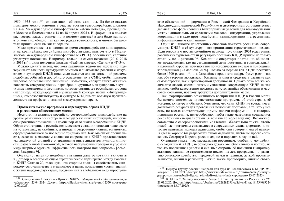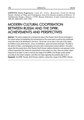 ОСЕТРОВА М. Е. РОССИЙСКО-СЕВЕРОКОРЕЙСКОЕ СОТРУДНИЧЕСТВО В СФЕРЕ КУЛЬТУРЫ НА СОВРЕМЕННОМ ЭТАПЕ: ДОСТИЖЕНИЯ И ЗОНЫ РОСТА // ВЛАСТЬ. 2025. ТОМ 33 № S4