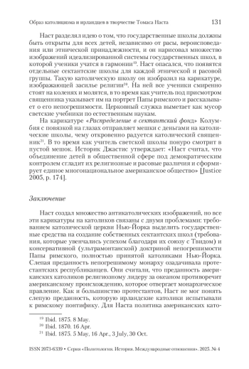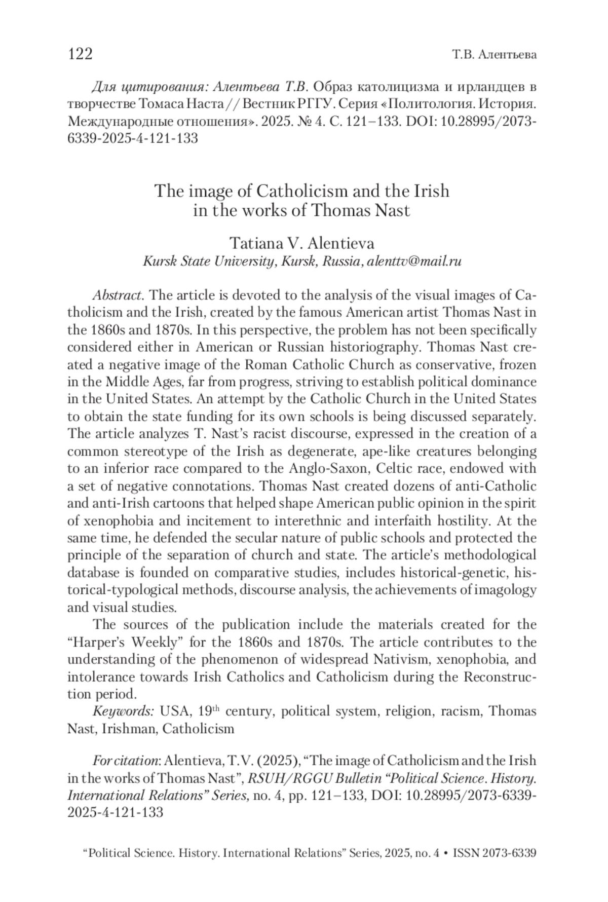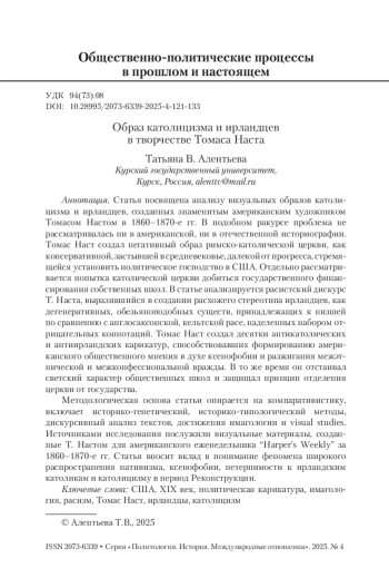 Статья посвящена анализу визуальных образов католицизма и ирландцев, созданных знаменитым американским художником Томасом Настом в 1860–1870-е гг. В подобном ракурсе проблема не рассматривалась ни в американской, ни в отечественной историографии. Томас Наст создал негативный образ римско-католической церкви, как консервативной, застывшей в средневековье, далекой от прогресса, стремящейся установить политическое господство в США. Отдельно рассматривается попытка католической церкви добиться государственного финансирования собственных школ. В статье анализируется расистский дискурс Т. Наста, выразившийся в создании расхожего стереотипа ирландцев, как дегенеративных, обезьяноподобных существ, принадлежащих к низшей по сравнению с англосаксонской, кельтской расе, наделенных набором отрицательных коннотаций. Томас Наст создал десятки антикатолических и антиирландских карикатур, способствовавших формированию американского общественного мнения в духе ксенофобии и разжигания межэтнической и межконфессиональной вражды. В то же время он отстаивал светский характер общественных школ и защищал принцип отделения церкви от государства. Методологическая основа статьи опирается на компаративистику, включает историко-генетический, историко-типологический методы, дискурсивный анализ текстов, достижения имагологии и visual studies. Источниками исследования послужили визуальные материалы, созданные Т. Настом для американского еженедельника “Harper’s Weekly” за 1860–1870-е гг. Статья вносит вклад в понимание феномена широкого распространения нативизма, ксенофобии, нетерпимости к ирландским католикам и католицизму в период Реконструкции.