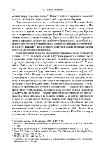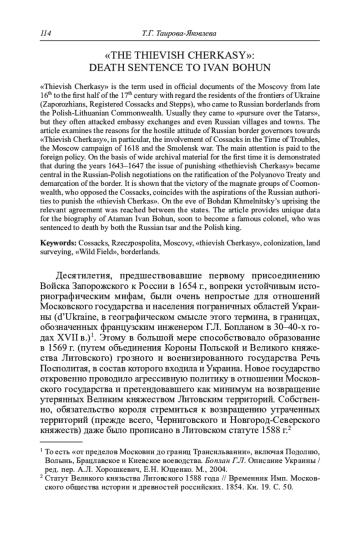 «Воровскими черкасами» назывались в официальных документах Московского государства конца XVI – первой половины XVII в. жители пограничных территорий Украины (запорожцы, реестровые и степовики), вторгавшиеся на русское пограничье из Речи Посполитой. Обычно они приходили для «поиска над татарами», но нередко нападали на посольские размены и даже станицы и города. В статье рассматривается причина враждебного отношения русских порубежных воевод к «воровским черкасам». В частности, их участие в Смуте, Московском походе 1618 г. и Смоленской войне. Основное внимание в статье уделяется внешнеполитическому контексту. На основе широкого архивного материала впервые показано, что на протяжении 1643–1647 гг. вопрос о наказании «воровских черкас» становится центральным в русско-польских переговорах о ратифицировании Поляновского договора и межевании границы. Показано, что победа магнатских группировок Речи Посполитой, выступавших против казачества, совпадает со стремлениями русских властей наказать «воровских черкас». Накануне восстания Б. Хмельницкого такое соглашение между государствами было достигнуто. В статье приводятся уникальные данные к биографии атамана Ивана Богуна, будущего знаменитого полковника, в частности, что ему был вынесен смертный приговор как русским царем, так и польским королем.