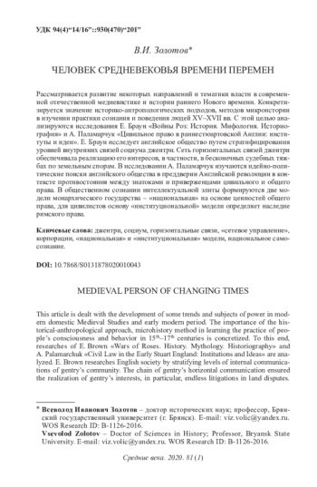 ЗОЛОТОВ В. И. ЧЕЛОВЕК СРЕДНЕВЕКОВЬЯ ВРЕМЕНИ ПЕРЕМЕН // СРЕДНИЕ ВЕКА. 2020. Т. 81 № 1