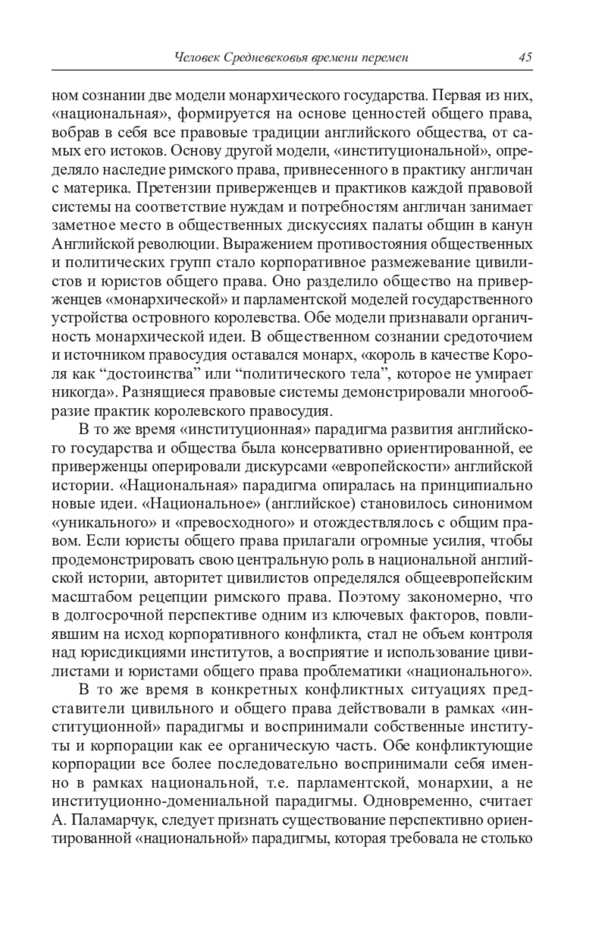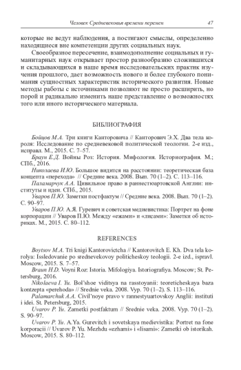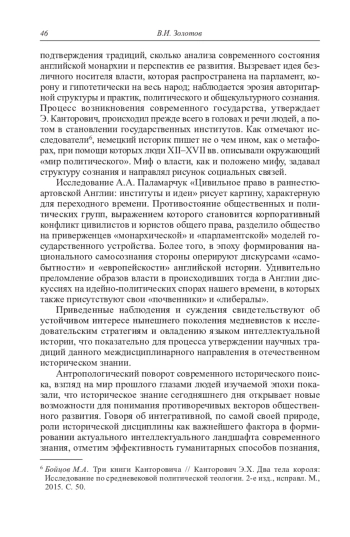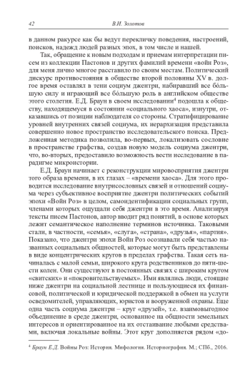 Рассматривается развитие некоторых направлений и тематики власти в современной отечественной медиевистике и истории раннего Нового времени. Конкретизируется значение историко-антропологических подходов, методов микроистории в изучении практики сознания и поведения людей XV–XVII вв. С этой целью анализируются исследования Е. Браун «Войны Роз: История. Мифология. Историография» и А. Паламарчук «Цивильное право в раннестюартовской Англии: институты и идеи». Е. Браун исследует английское общество путем стратифицирования уровней внутренних связей социума джентри. Сеть горизонтальных связей джентри обеспечивала реализацию его интересов, в частности, в бесконечных судебных тяжбах по земельным спорам. В исследовании А. Паламарчук изучаются идейно-политические поиски английского общества в преддверии Английской революции в контексте противостояния между знатоками и приверженцами цивильного и общего права. В общественном сознании интеллектуальной элиты формируются две модели монархического государства – «национальная» на основе ценностей общего права, для цивилистов основу «институциональной» модели определяет наследие римского права