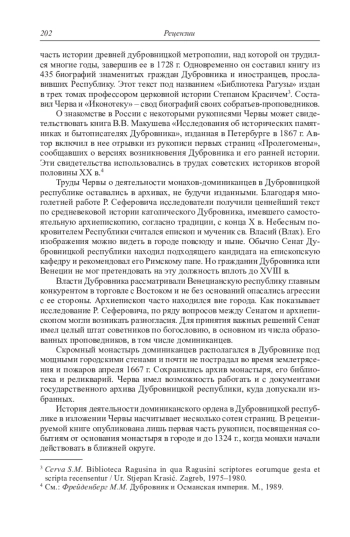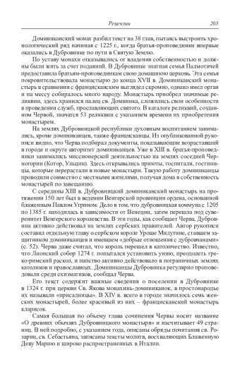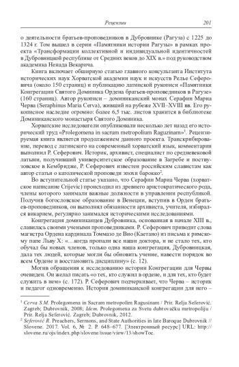 Рецензируемая книга о Конгрегации Ордена братьев-проповедников Дубровника (Рагуза) издана в 2017 г. к 800-летию образования доминиканского ордена в Европе. Том включает исследовательскую статью ведущего научного сотрудника Института исторических наук Хорватской академии наук и искусств в Дубровнике Релье Сеферовича и публикацию латинской рукописи «Памятники Конгрегации Святого Доминика Ордена братьев-проповедников в Рагузе», автором которой является Серафин Мариа Черва (1686–1759). Книга содержит важные свидетельства о религиозной жизни на Балканах в XIII–XIV вв. Российские медиевисты обнаруживают некоторые параллели в государственном устройстве Дубровника и русских городов, поэтому рецензируемая книга может пригодиться и в компаративистских исследованиях.
