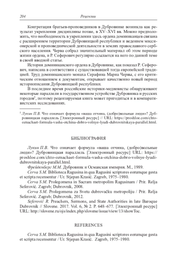 Статья: ЧЕРВА С. М. ПАМЯТНИКИ КОНГРЕГАЦИИ СВЯТОГО ДОМИНИКА ОРДЕНА БРАТЬЕВ-ПРОПОВЕДНИКОВ В РАГУЗЕ. КНИГА ПЕРВАЯ / ПЕР., ВСТУПИТ, СТ., КОММЕНТ. РЕ ЛЬЕ СЕФЕРОВИЧА. ЗАГРЕБ; ДУБРОВНИК, 2017. 384 С (2020)