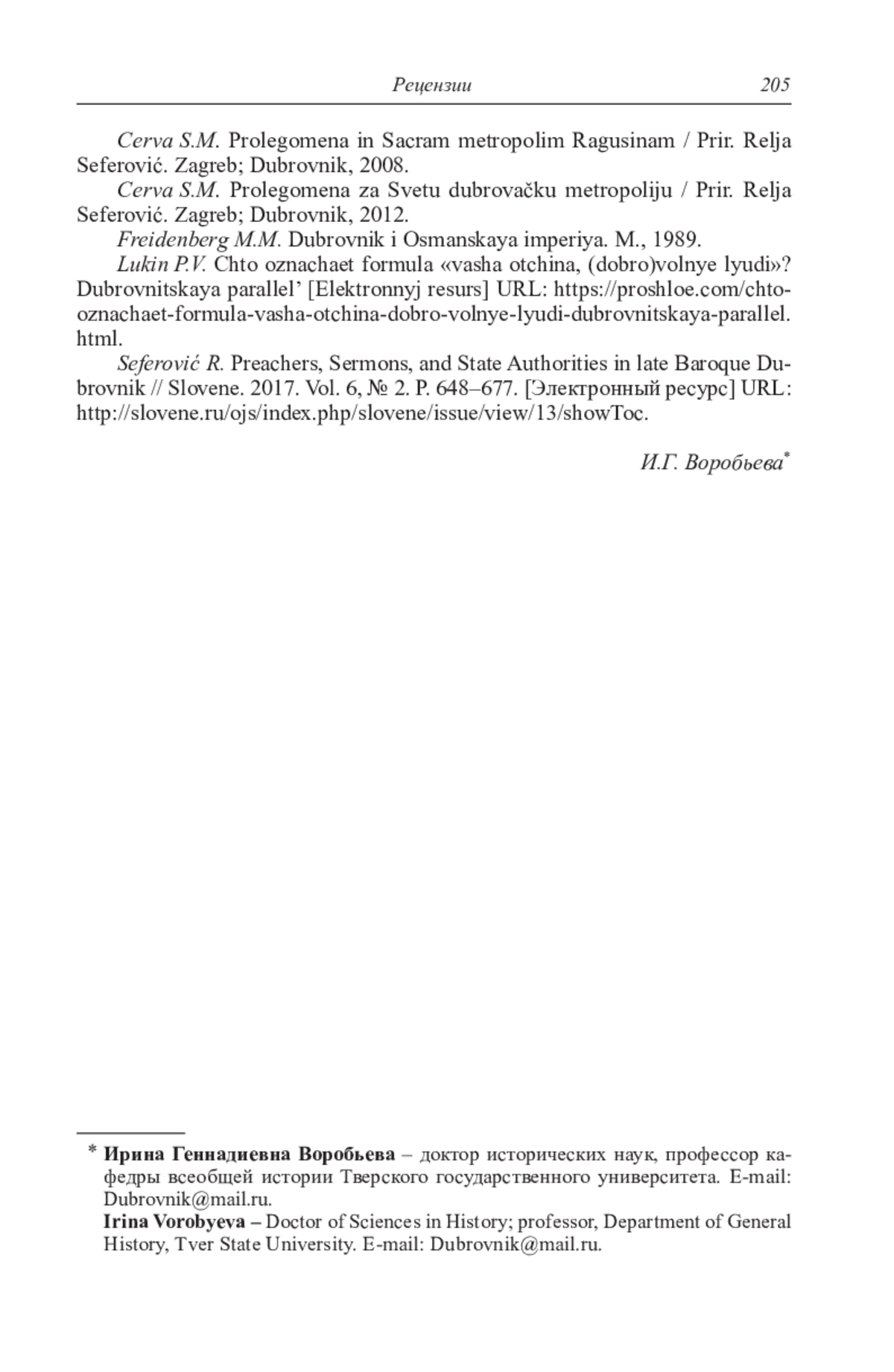 ВОРОБЬЕВА И. Г. ЧЕРВА С. М. ПАМЯТНИКИ КОНГРЕГАЦИИ СВЯТОГО ДОМИНИКА ОРДЕНА БРАТЬЕВ-ПРОПОВЕДНИКОВ В РАГУЗЕ. КНИГА ПЕРВАЯ / ПЕР., ВСТУПИТ, СТ., КОММЕНТ. РЕ ЛЬЕ СЕФЕРОВИЧА. ЗАГРЕБ; ДУБРОВНИК, 2017. 384 С // СРЕДНИЕ ВЕКА. 2020. Т. 81 № 1